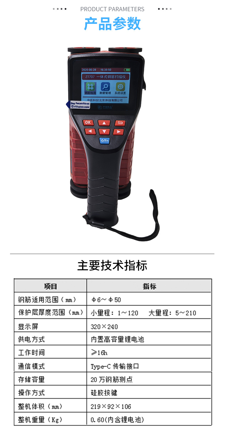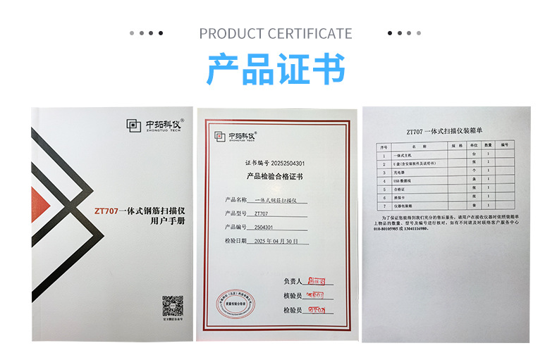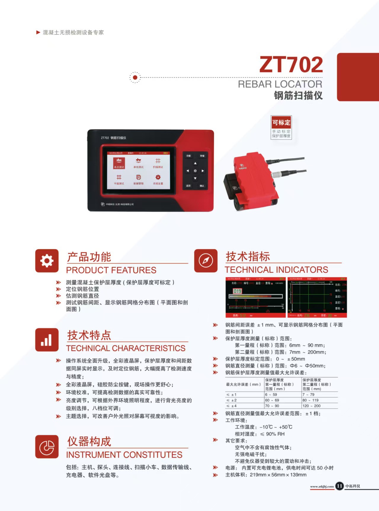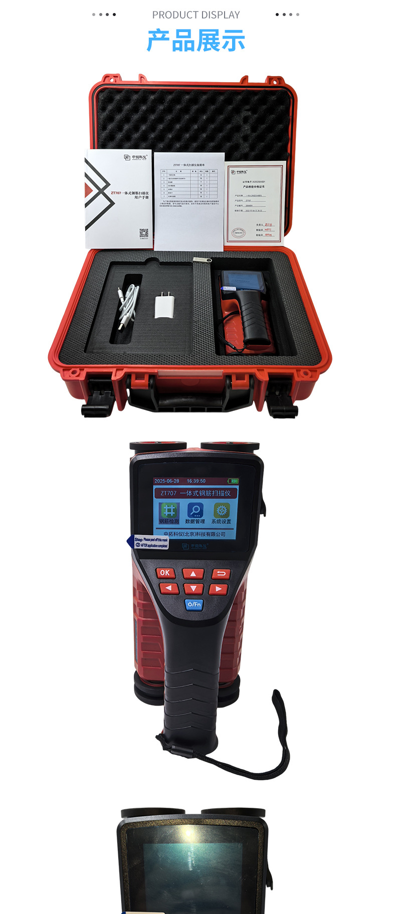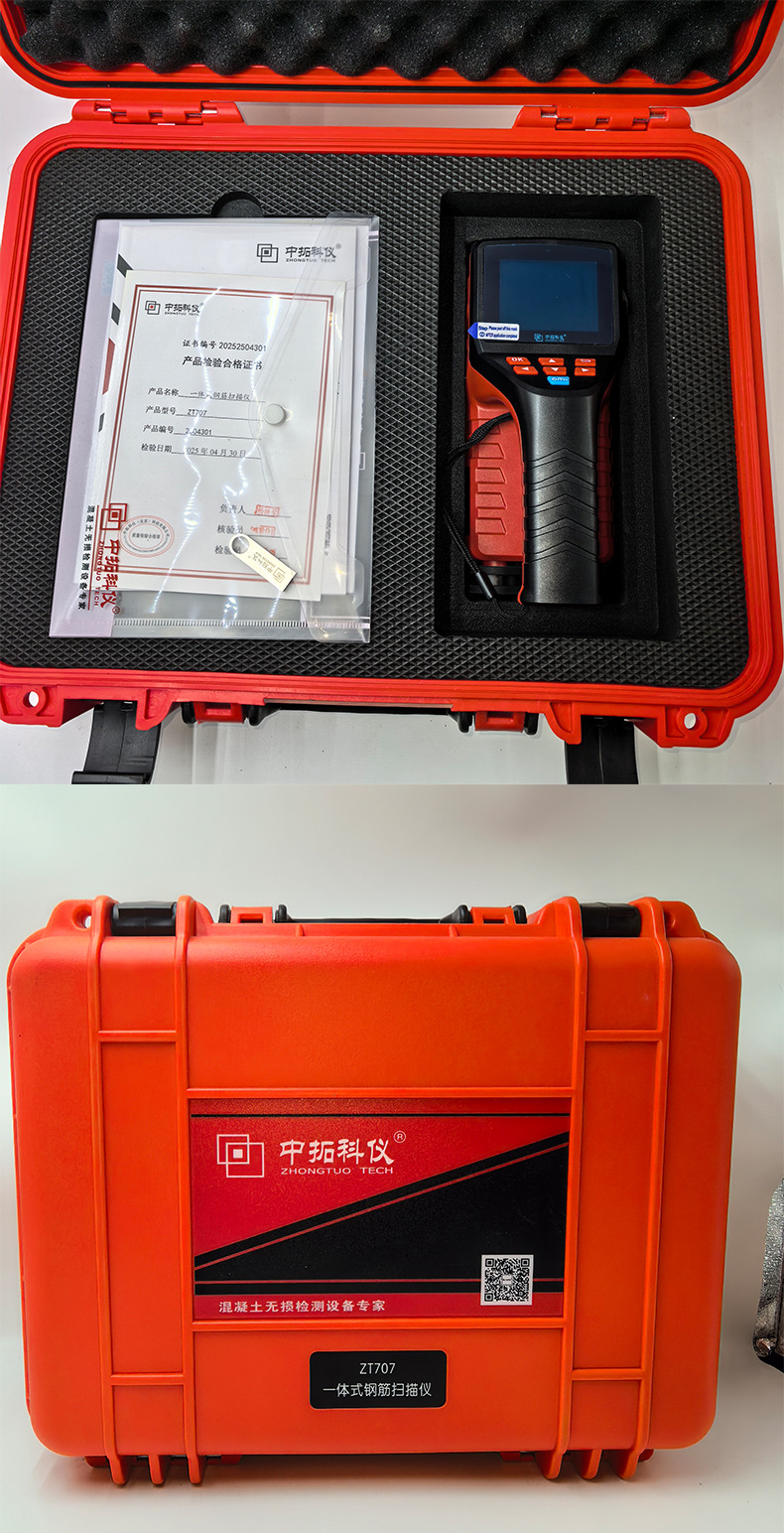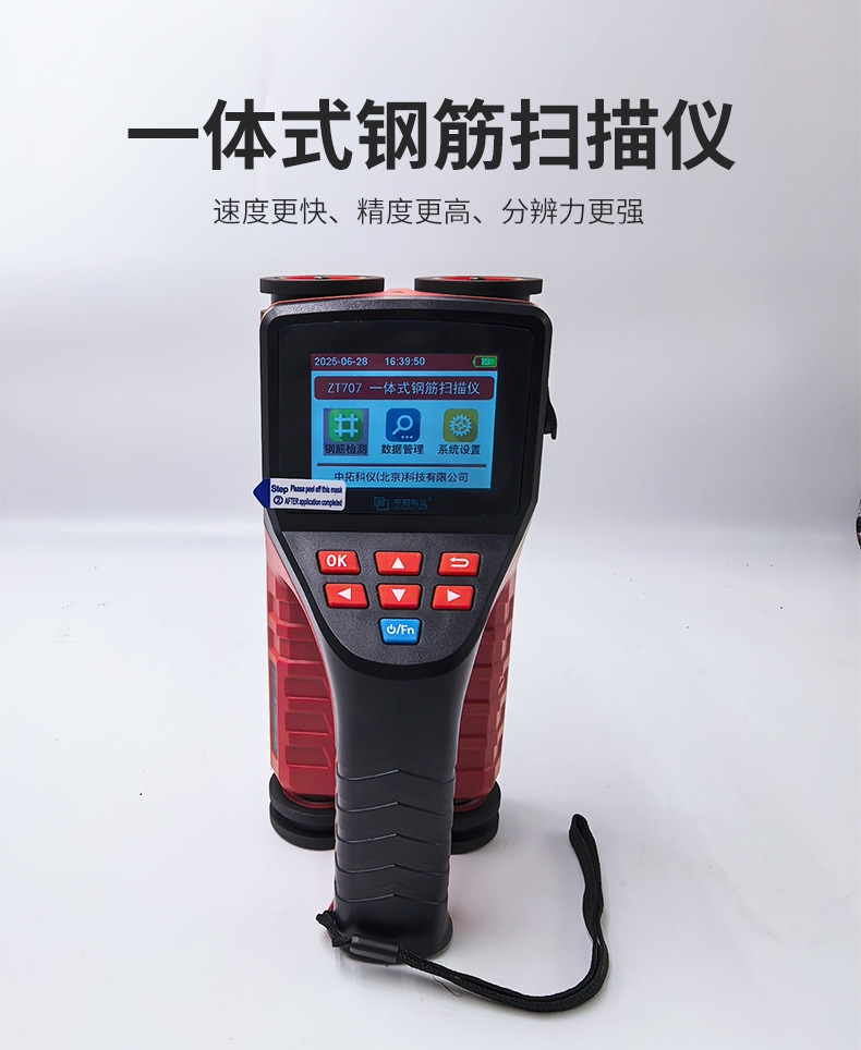 ZT707一体式钢筋扫描仪主要用于混凝土结构内部钢筋位置、保护层厚度、钢筋间距及钢筋直径等测试,并且能精确绘制整体钢筋的分布图,提供高精度、高速度检测数据;采用主机与传感器线圈一体式结构,携带及现场操作方便、快捷;采用多线圈结构设计,速度更快、精度更高、分辨力更强。