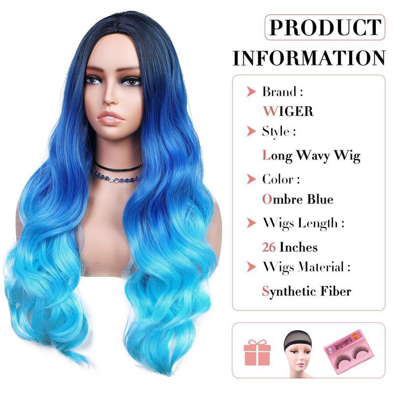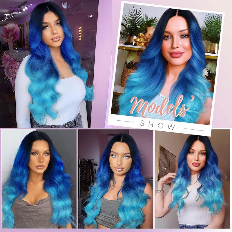 Hair Color: The Wavy Mermaid Blue Wig Will Show you A Gorgerous 3 Tone color Effect: Black-Dark Blue-Light Blue.Wig Material: The Ombre Blue Wig Is Made of High Quality Heat Resistant Synthetic Fiber, Soft Touch, Comfortable for Daily wear, Perfect for Cosplay.Wig Specification: This Ladies Wig Has 3 Combs to Secure And High Quality Rose Net Cap, More Breathable And Comfortable.Circumference Is 21.5-22.5 Inch Stretched Medium Cap, The Inner Cap Net Has Two Adjustable Straps, Suitable for Most Women Head Size.Hair Care: Please Apply Some Water or Hair Spray When Out of Package.Use A Wide Tooth Comb or Finger Comb from Ends to Roots Bit By Bit to Avoid Tangling.After A few Wears, Customers Can Soak Wig in Warm Water with Hair Softener, Rinse It And Air Dry.Wearing Occansion: Ours 3 tone ombre Blue wig with a charming middle part wig make it suitable for all types of skin colors and ages. The ombre color wigs(Black&Blue)are suitable for daily, costume, Masquerade, fashion show, Halloween, cosplay, theme party, wedding, Christmas, dating and so on.