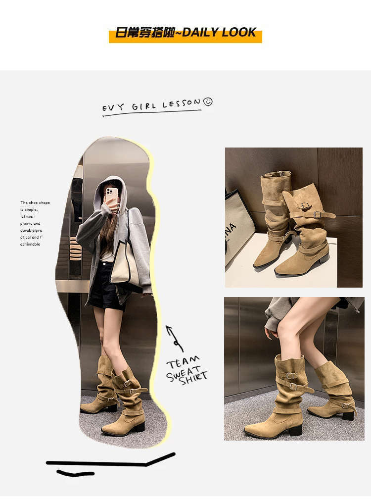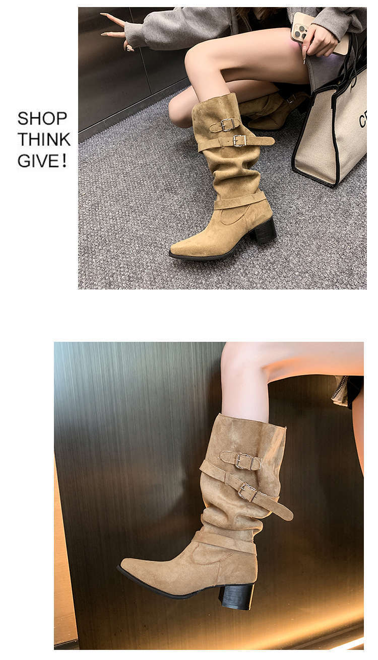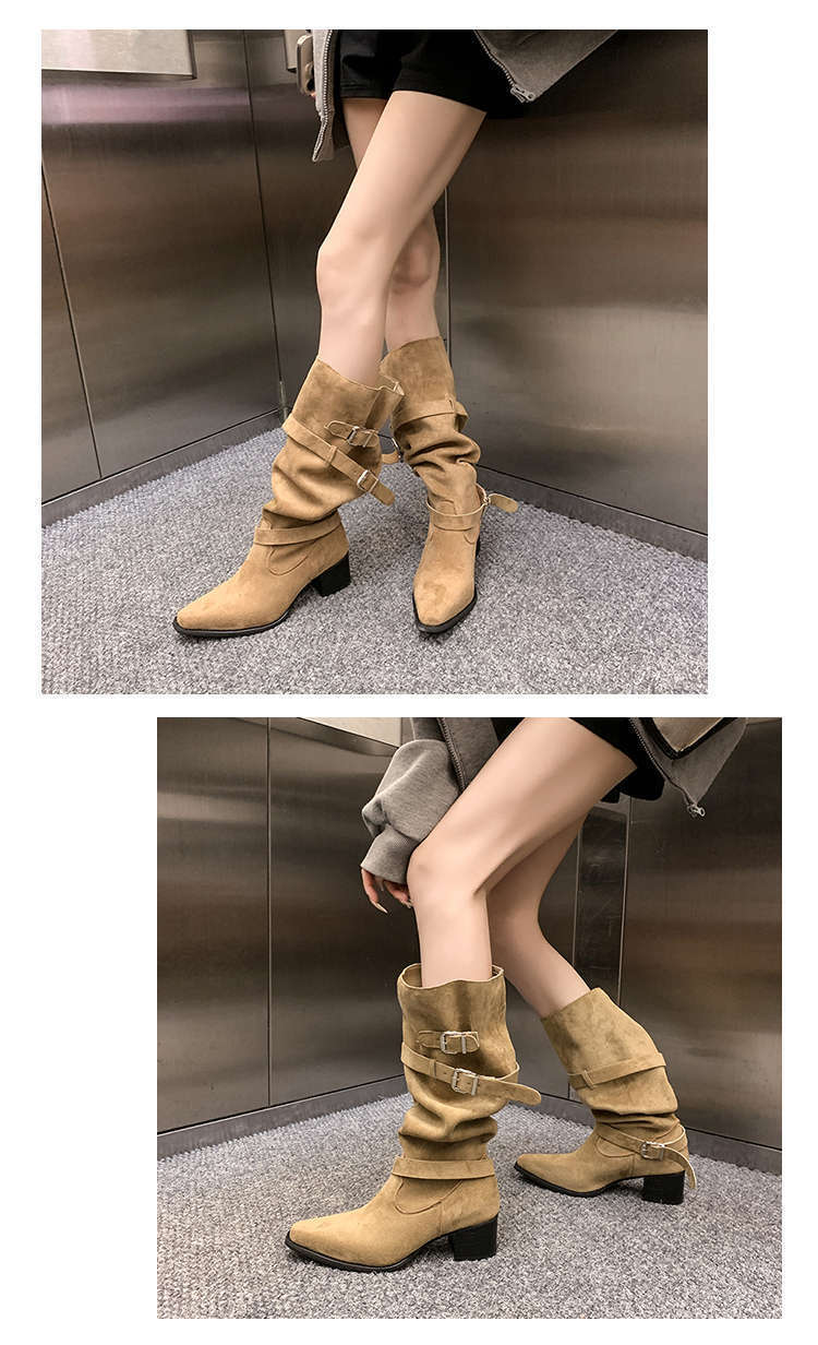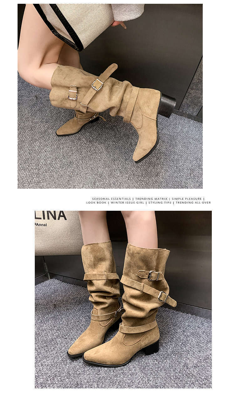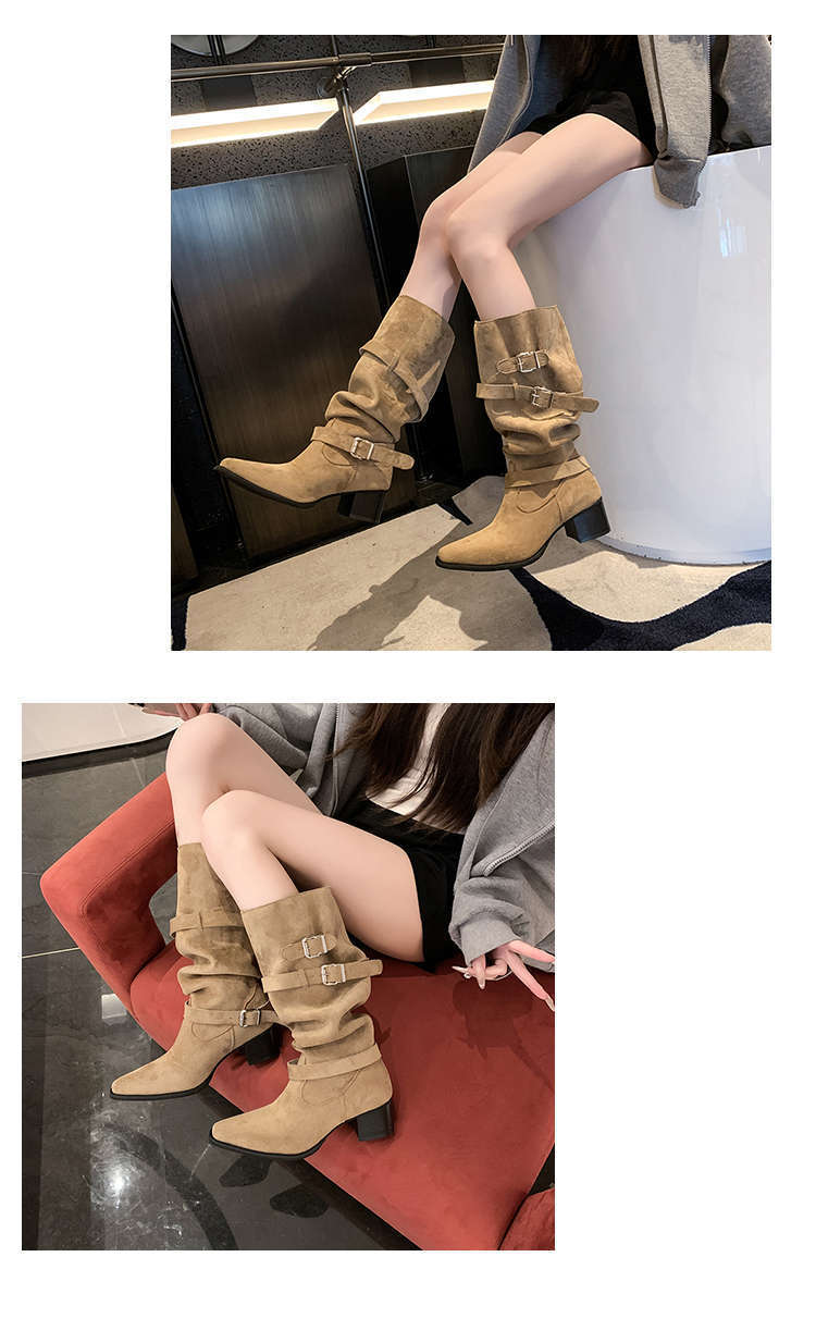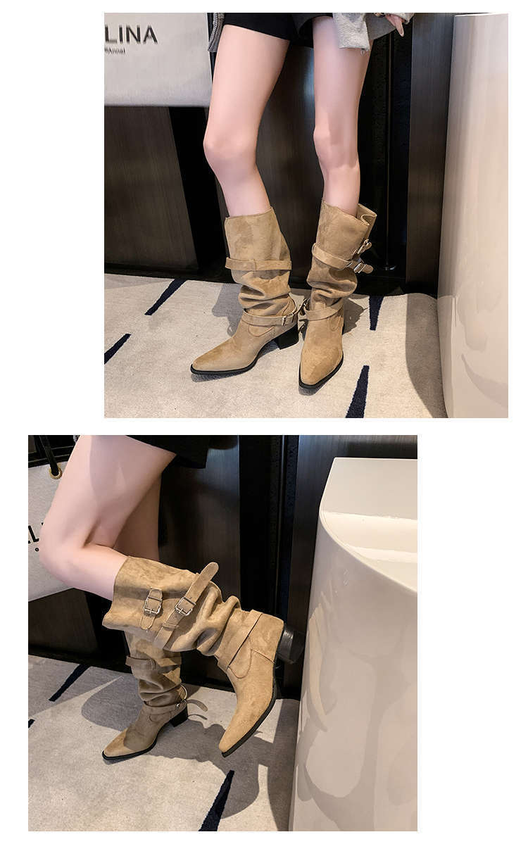Over-The-Knee Boots for Women 2025 Spring & Fall Khaki Suede Pointed-Toe Boots for Women Thick Heel Slimming Look Pleated Boots