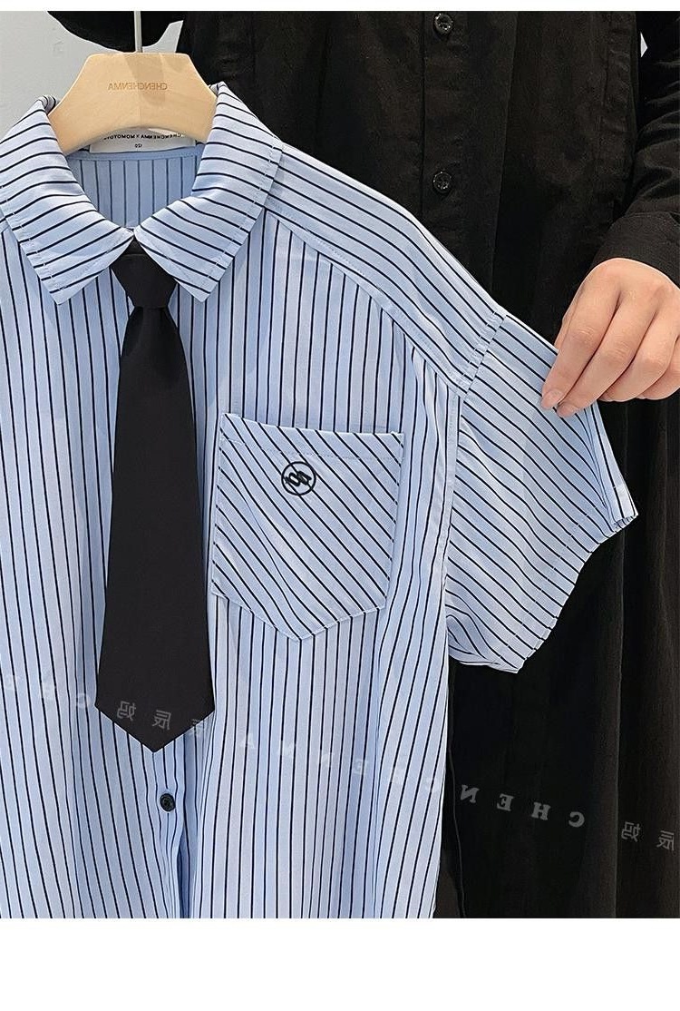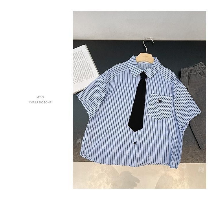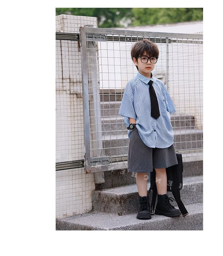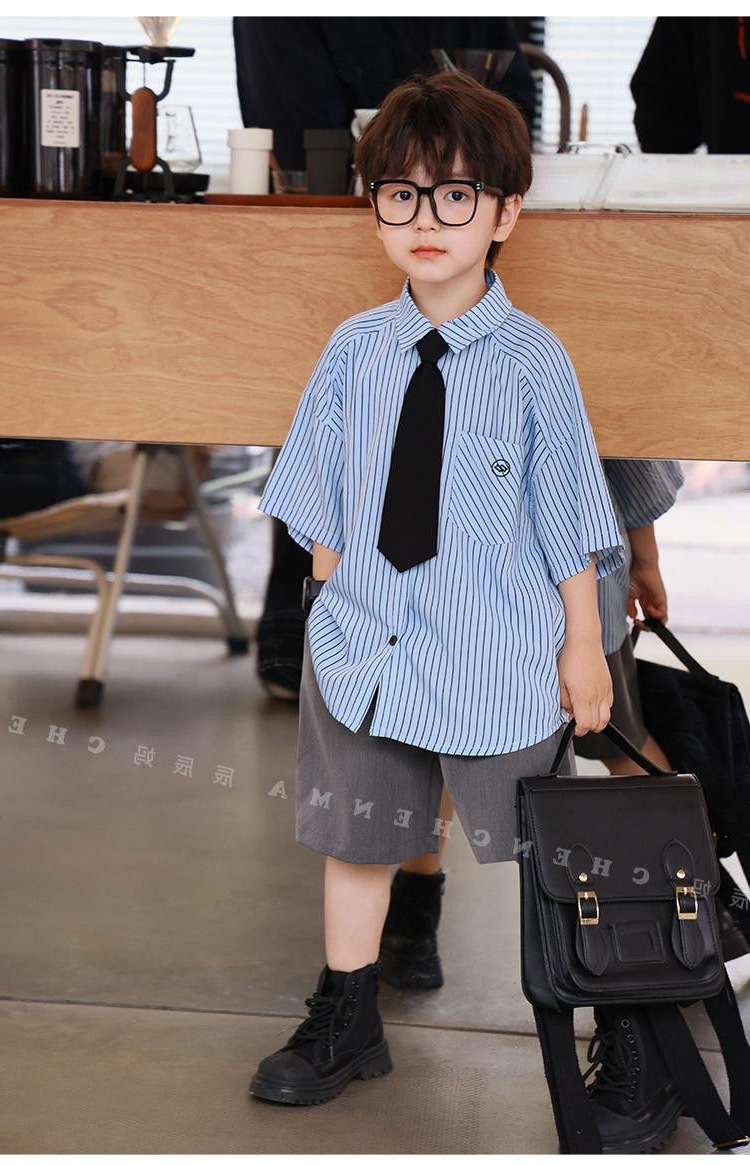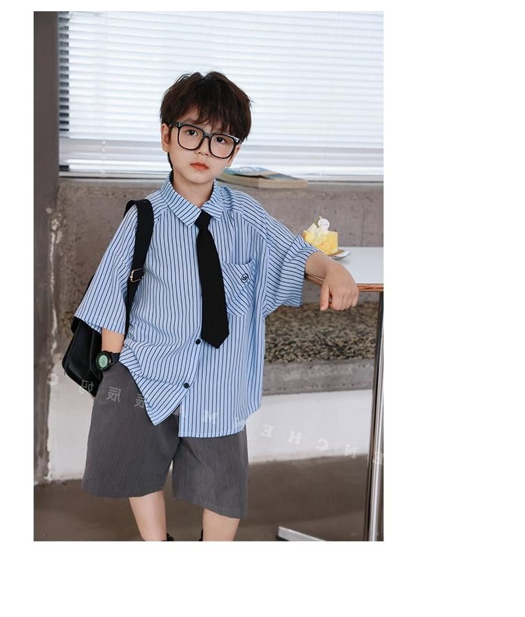 Blue stripes short-sleeved gray shorts tie, high quality anti-wrinkle and cool