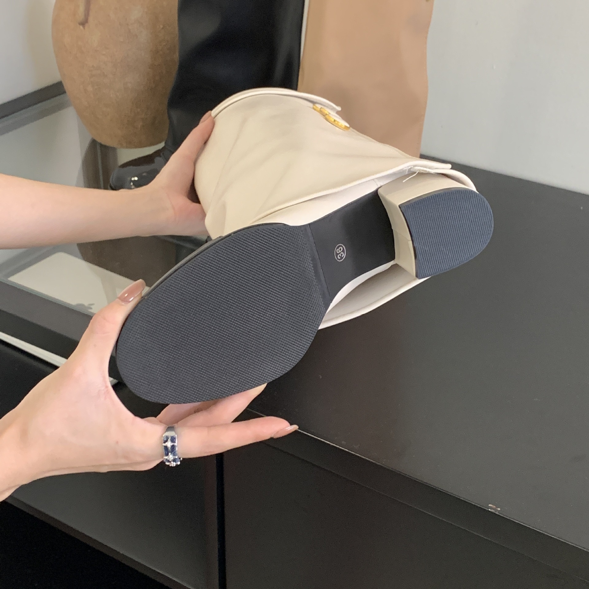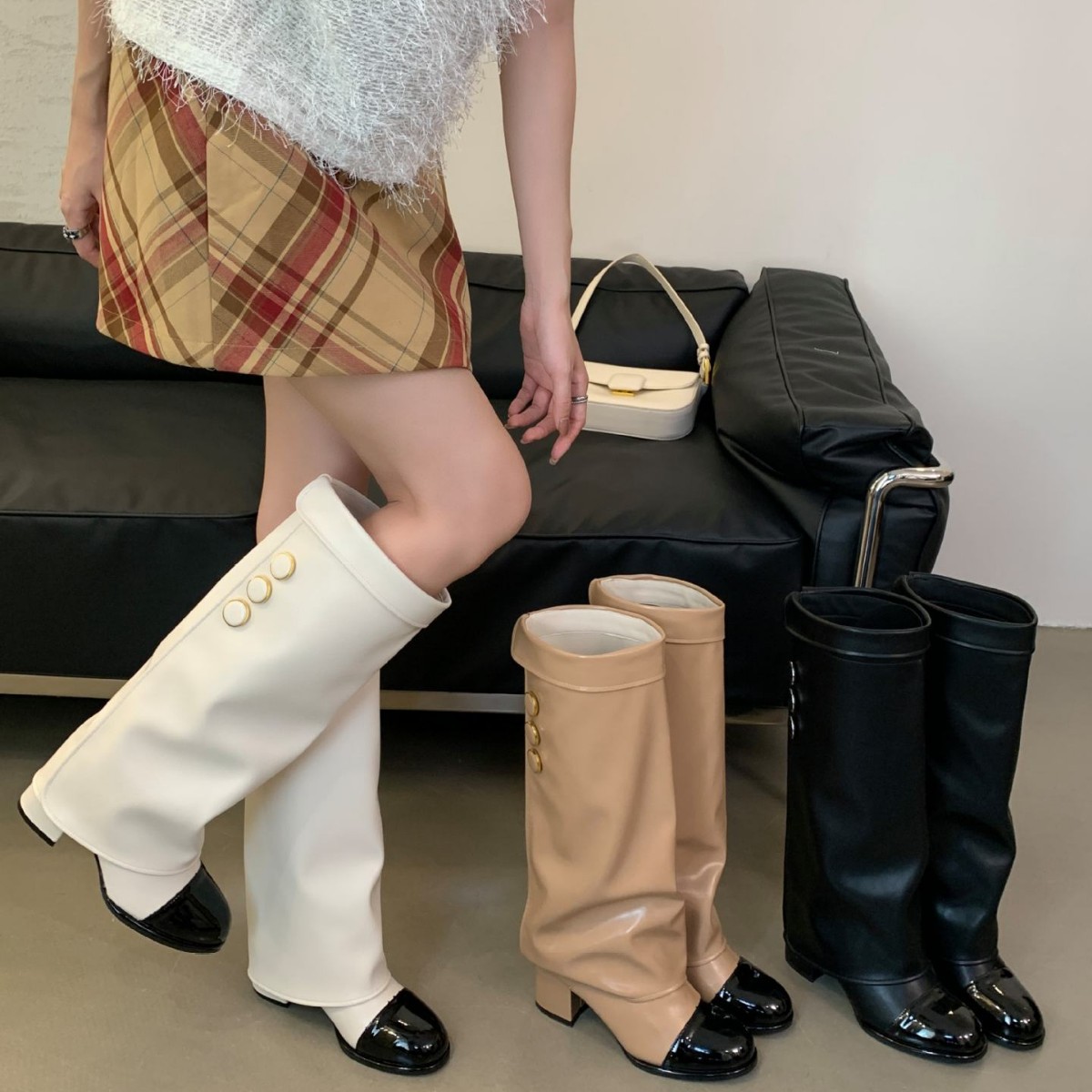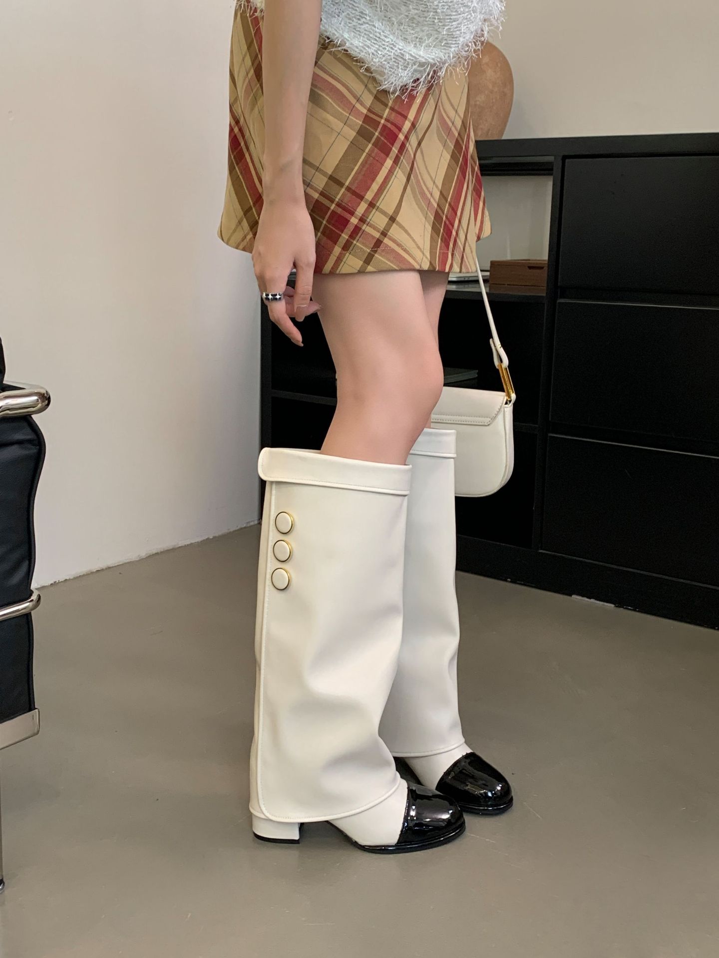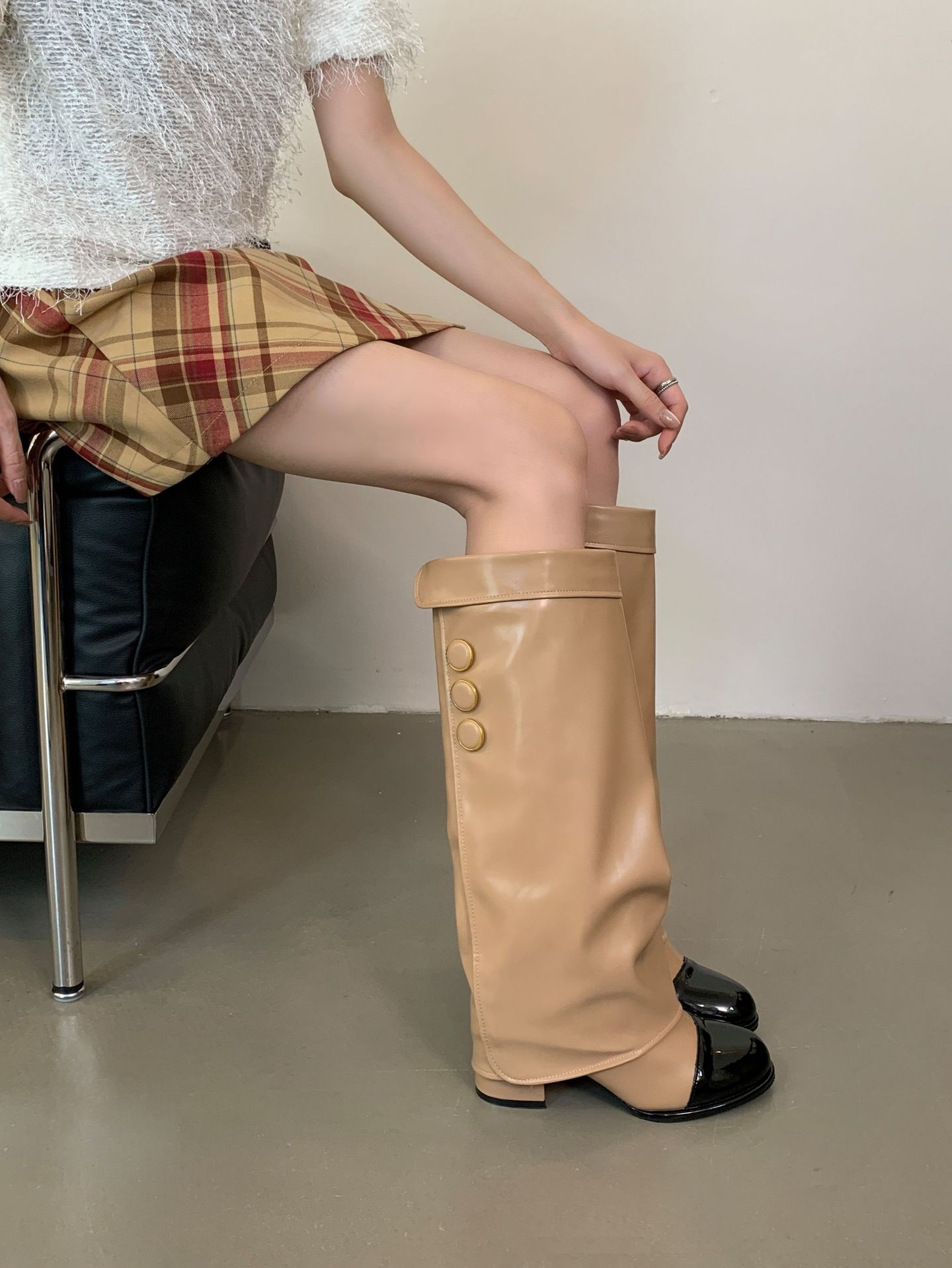 French-Style Small Fragrance Round-Toe Color-Blocked Riding Boots Versatile Chunky Heel High Boots Genuine Leather Over-The-Knee Boots Women's Trouser Boots