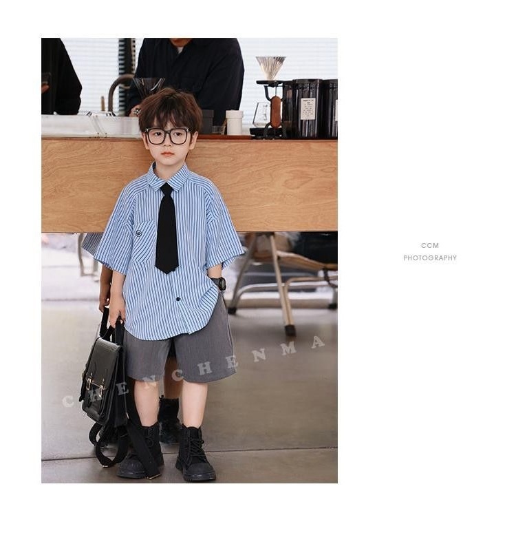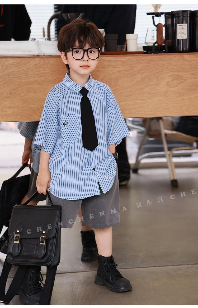 Blue stripes short-sleeved gray shorts tie, high quality anti-wrinkle and cool