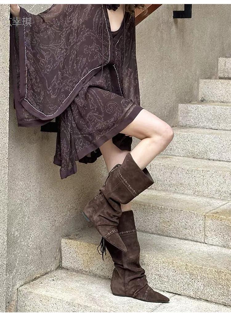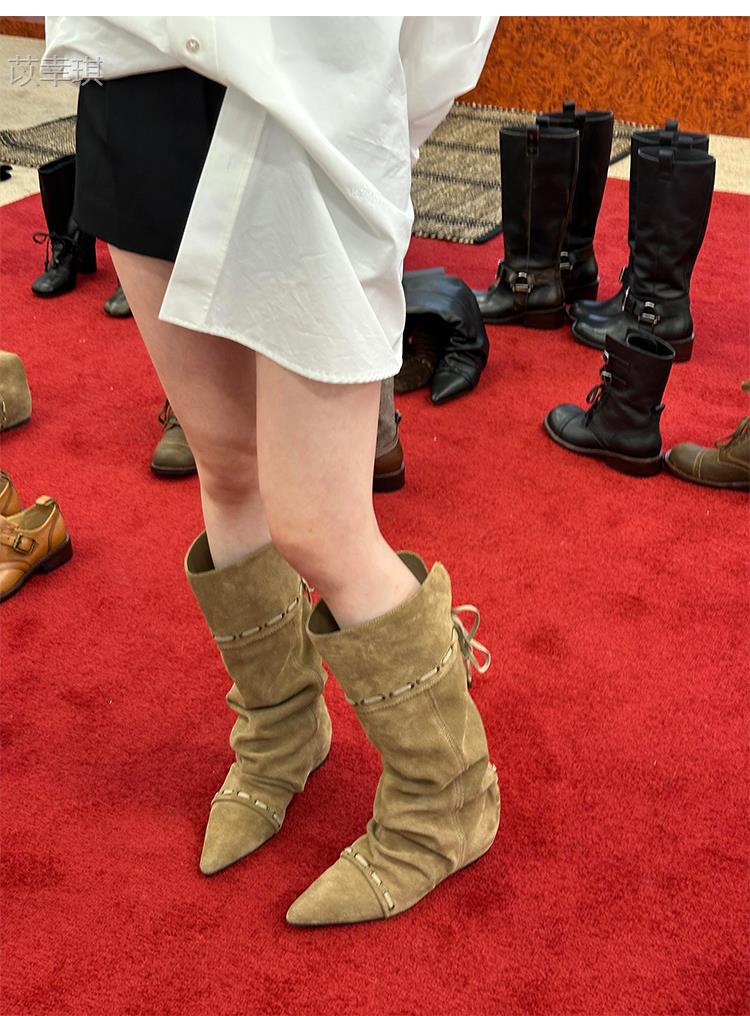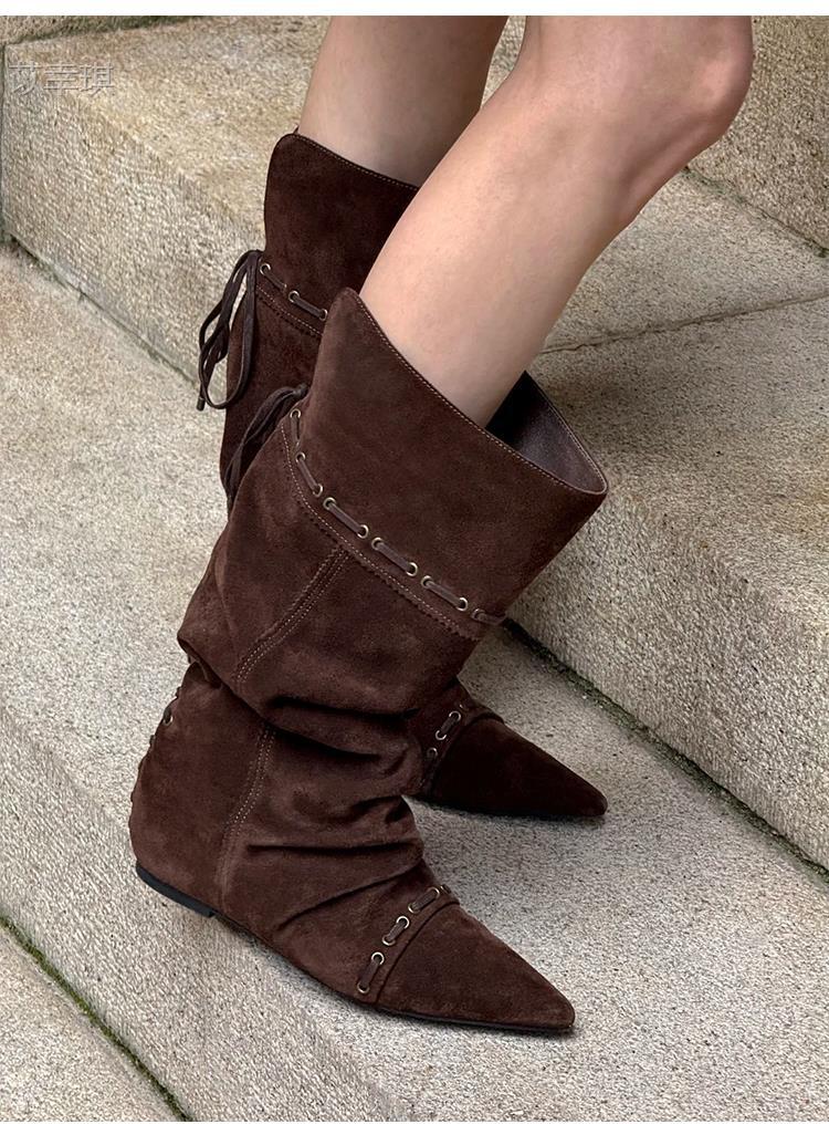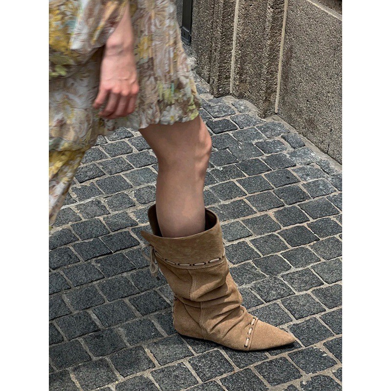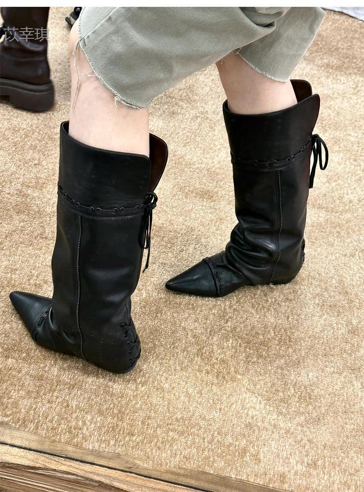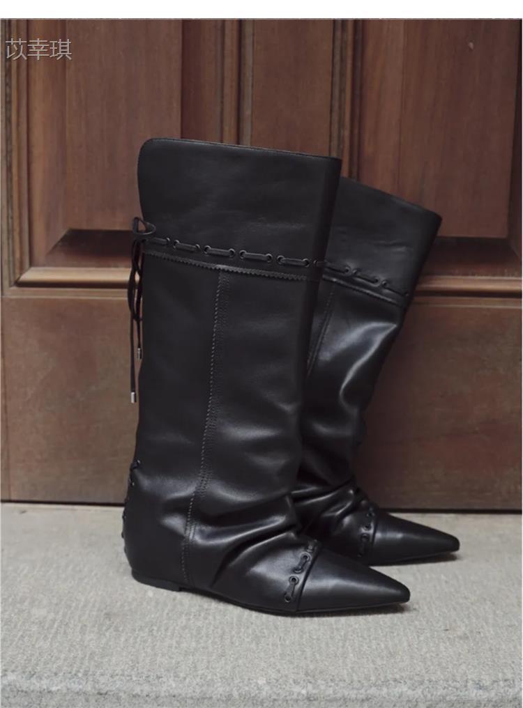 Sheepskin Version Two-Wear Pointed Toe Wide Boots Egyptian Women's Boots Genuine Leather High-Top Western Cowboy Boots Women's Inner Heightening Boots