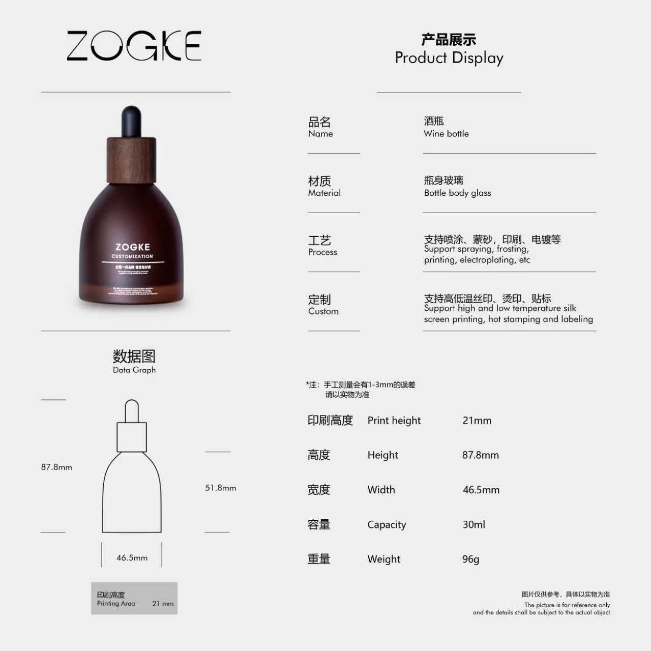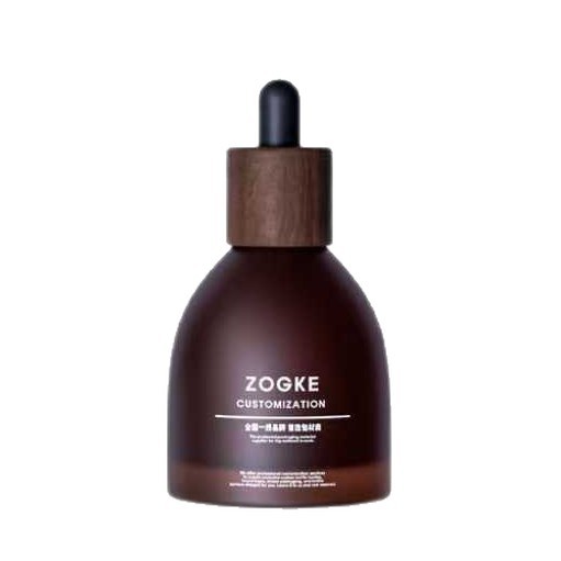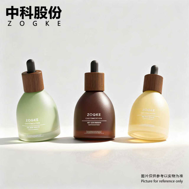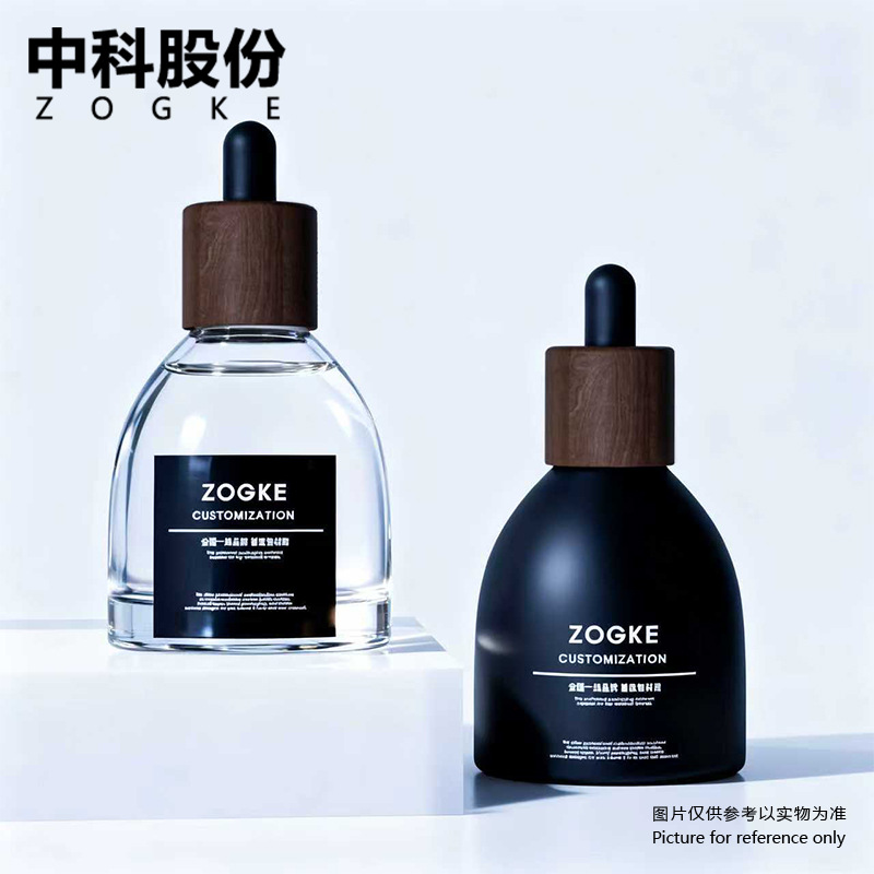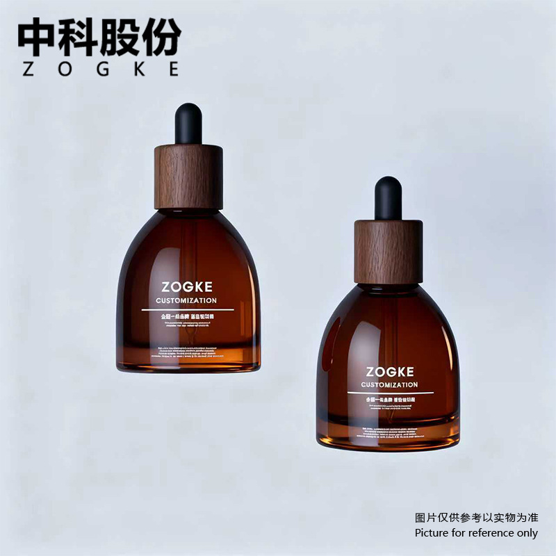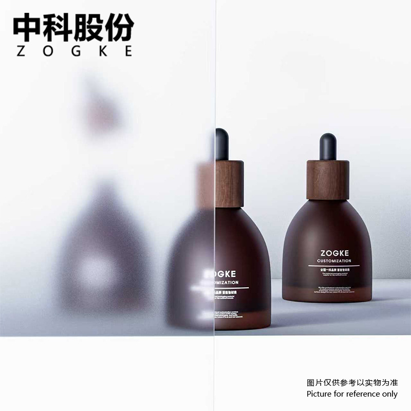30ml frosted brown wine bottle with walnut wood ring + matte black plastic head; glass; blank bottle