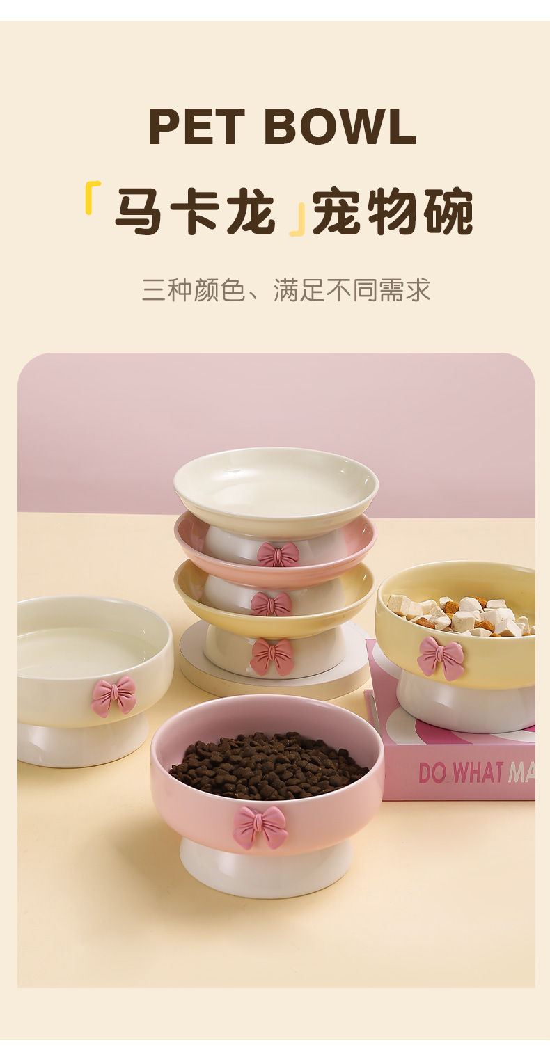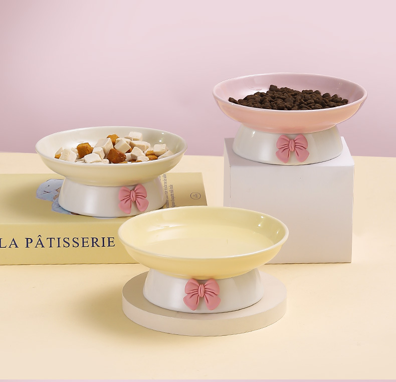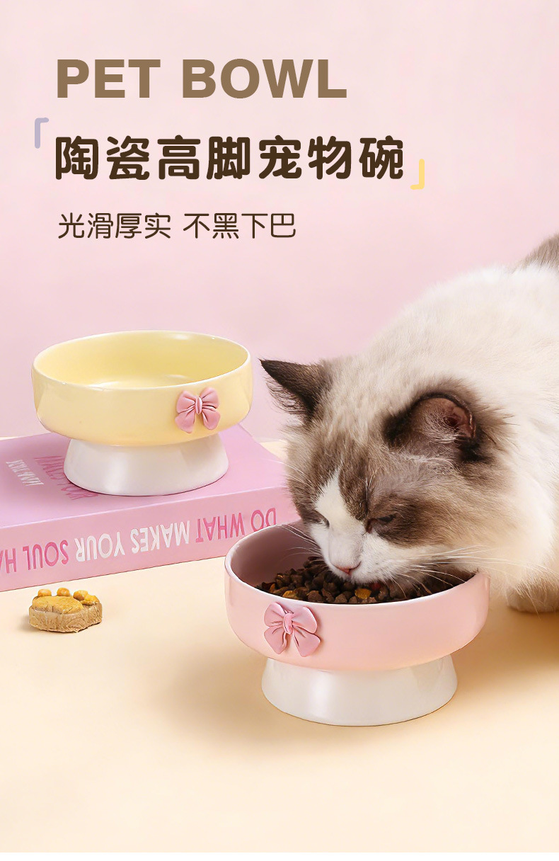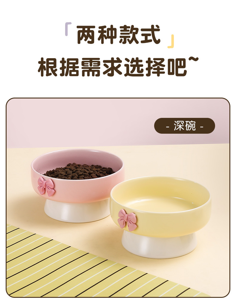Water and food bowl [ceramic bowl + exquisite bow] light yellow