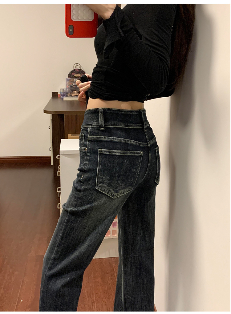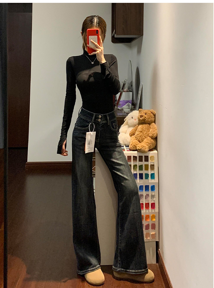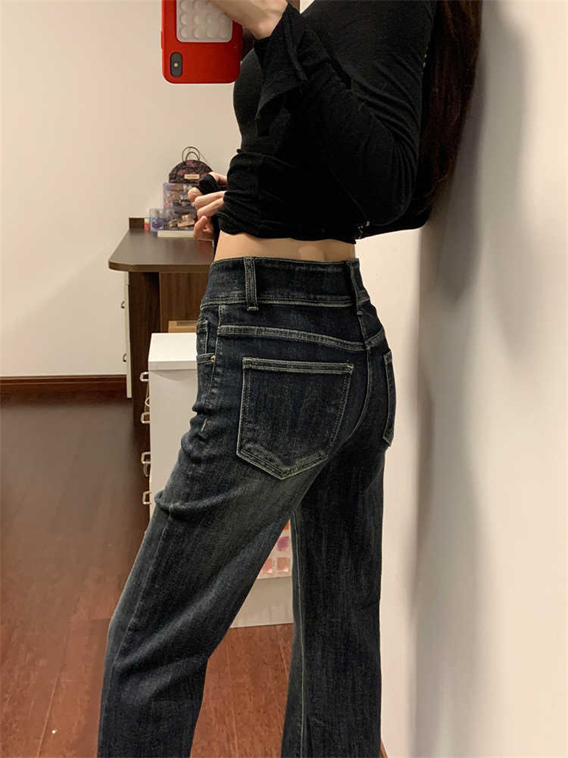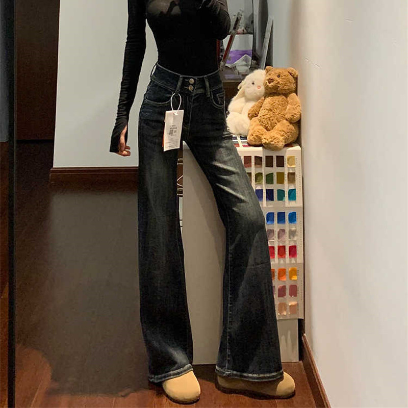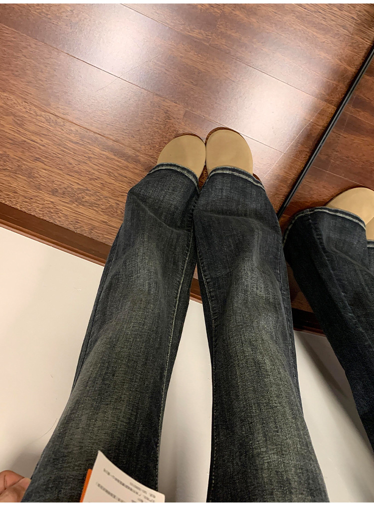 Thin Bootcut Jeans for Women Autum 2025 New American Retro Blue Gray High Waist Elastic Floor-Length Flared Pants