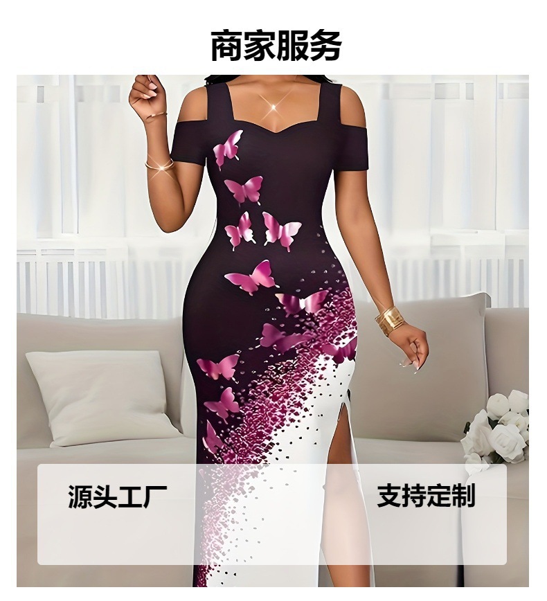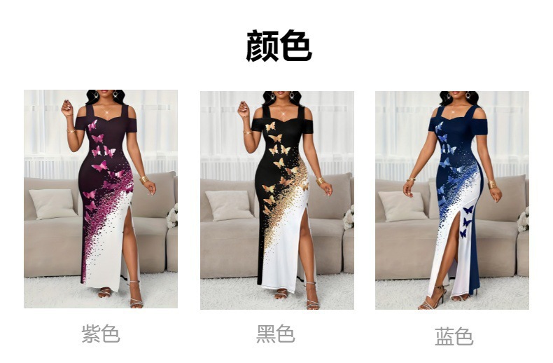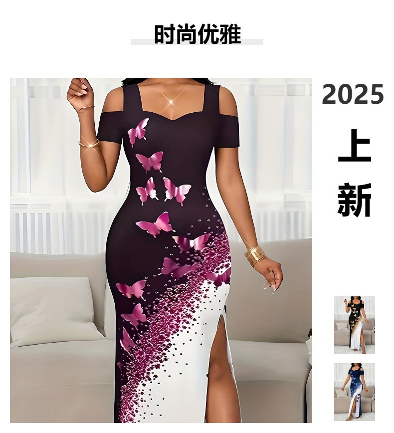 2025 New Cross-Border European and American Women's Fashionable and Elegant Contrasting Color Butterfly Print Off-Shoulder Slit Long Dress