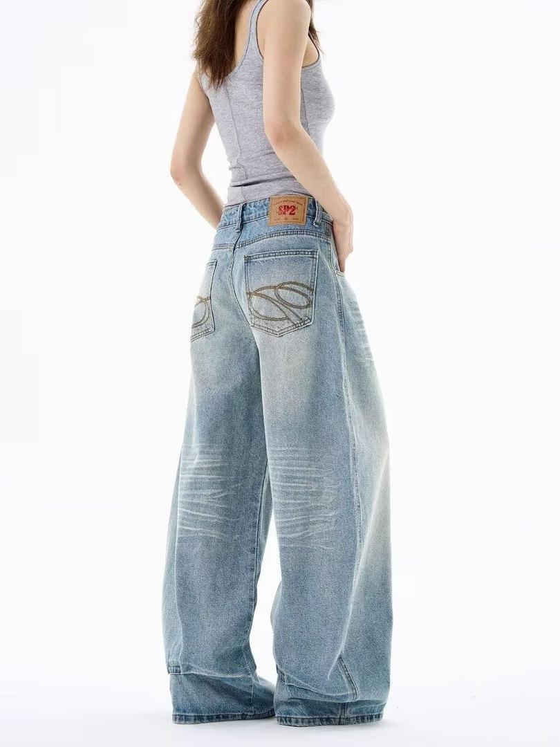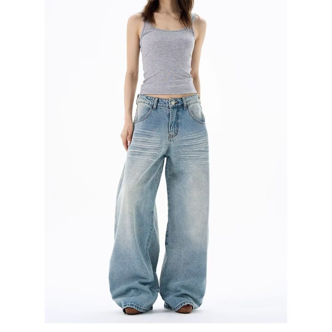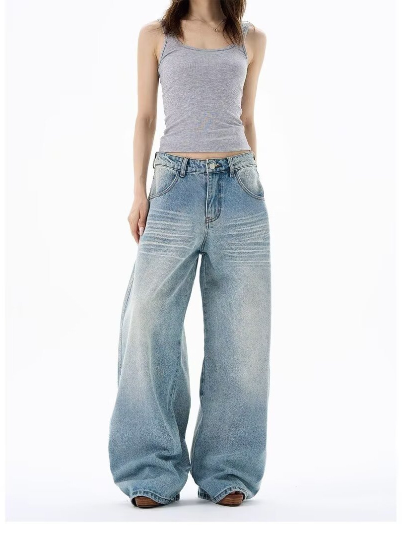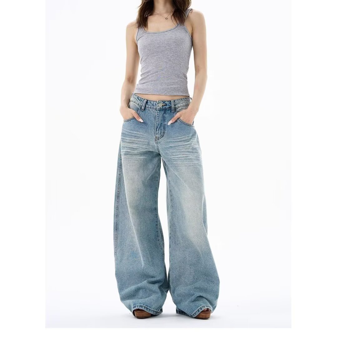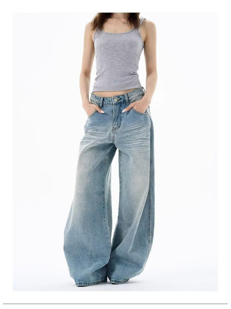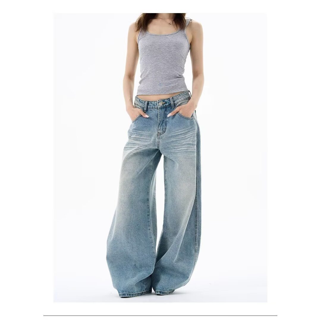 Light-Colored Ripped Jeans for Women, Spring and Autumn, Plus Size, Low-Rise, Pocket Design, Wide-Leg, Straight, Floor-Length Pants