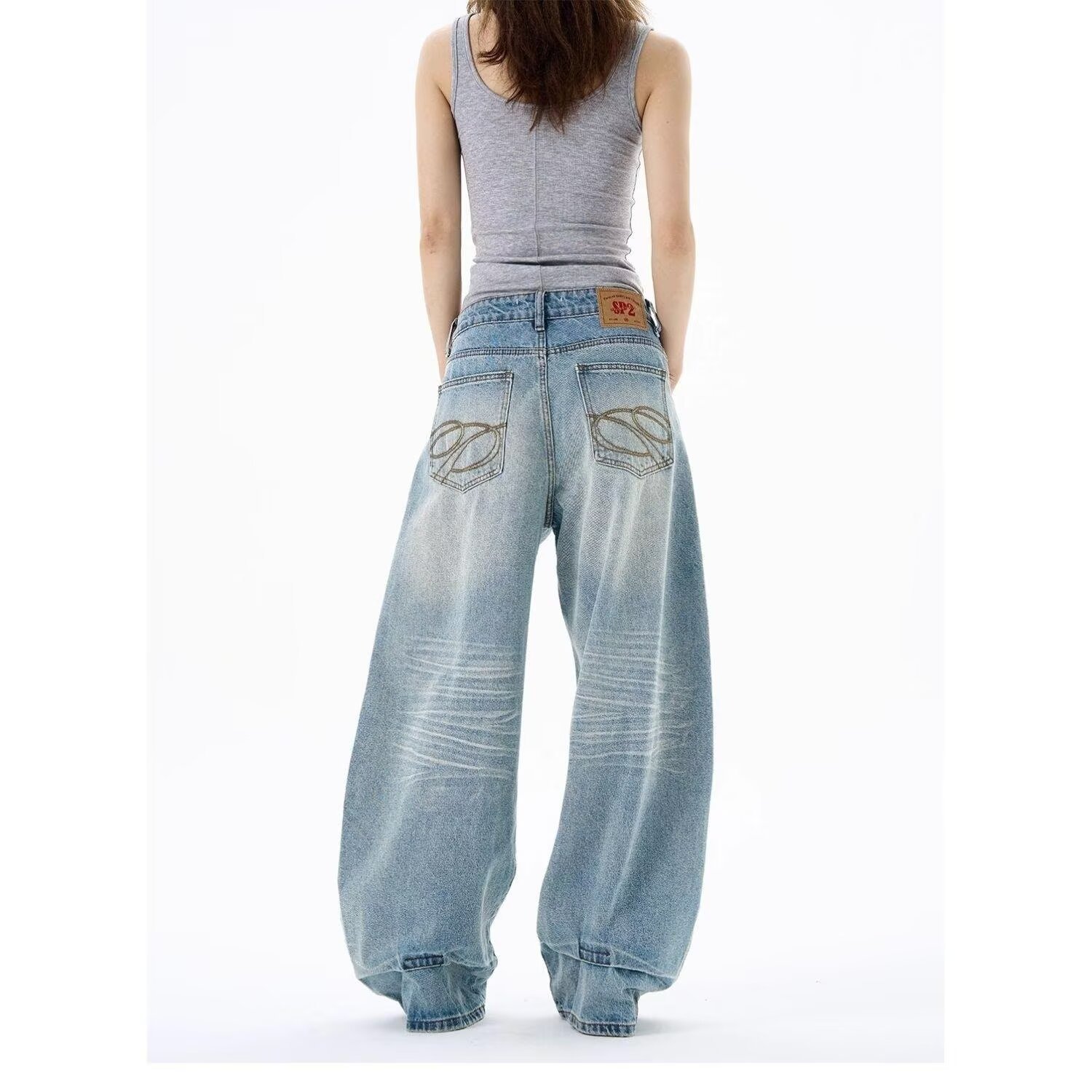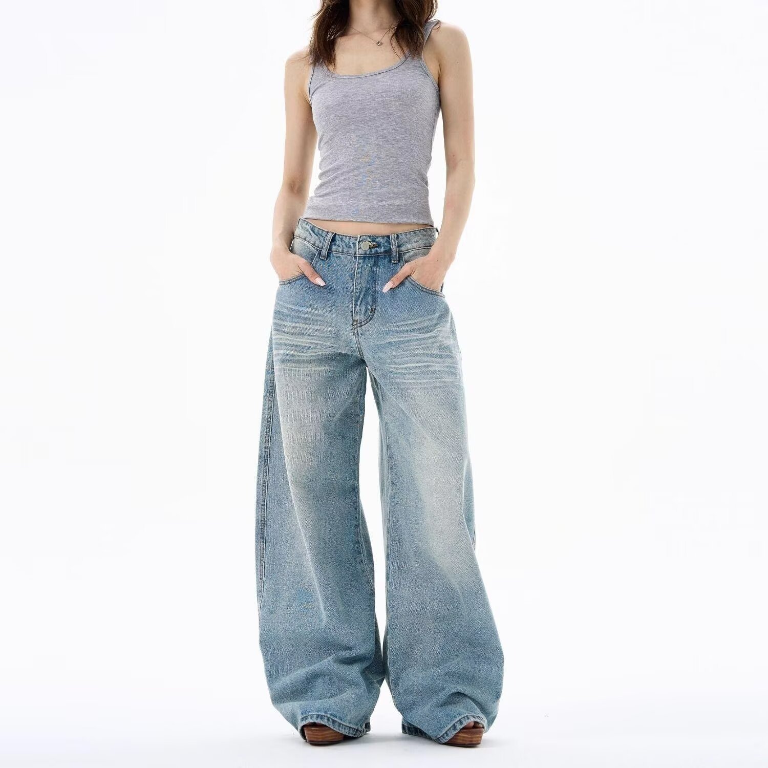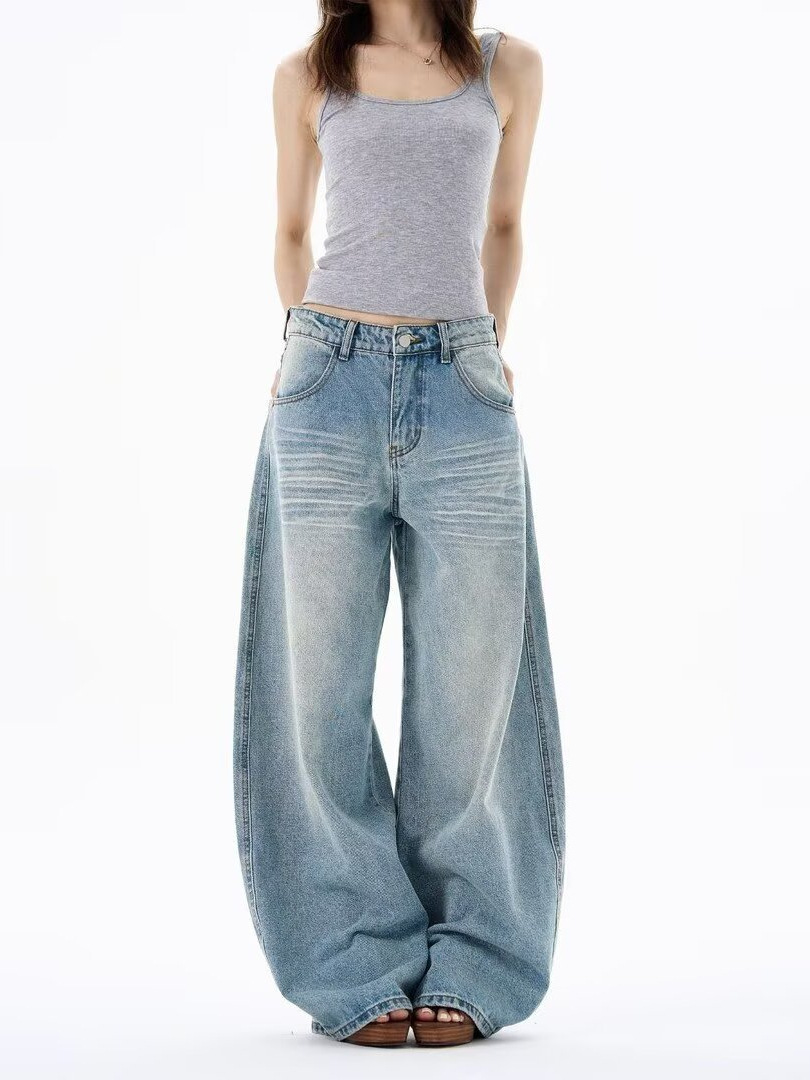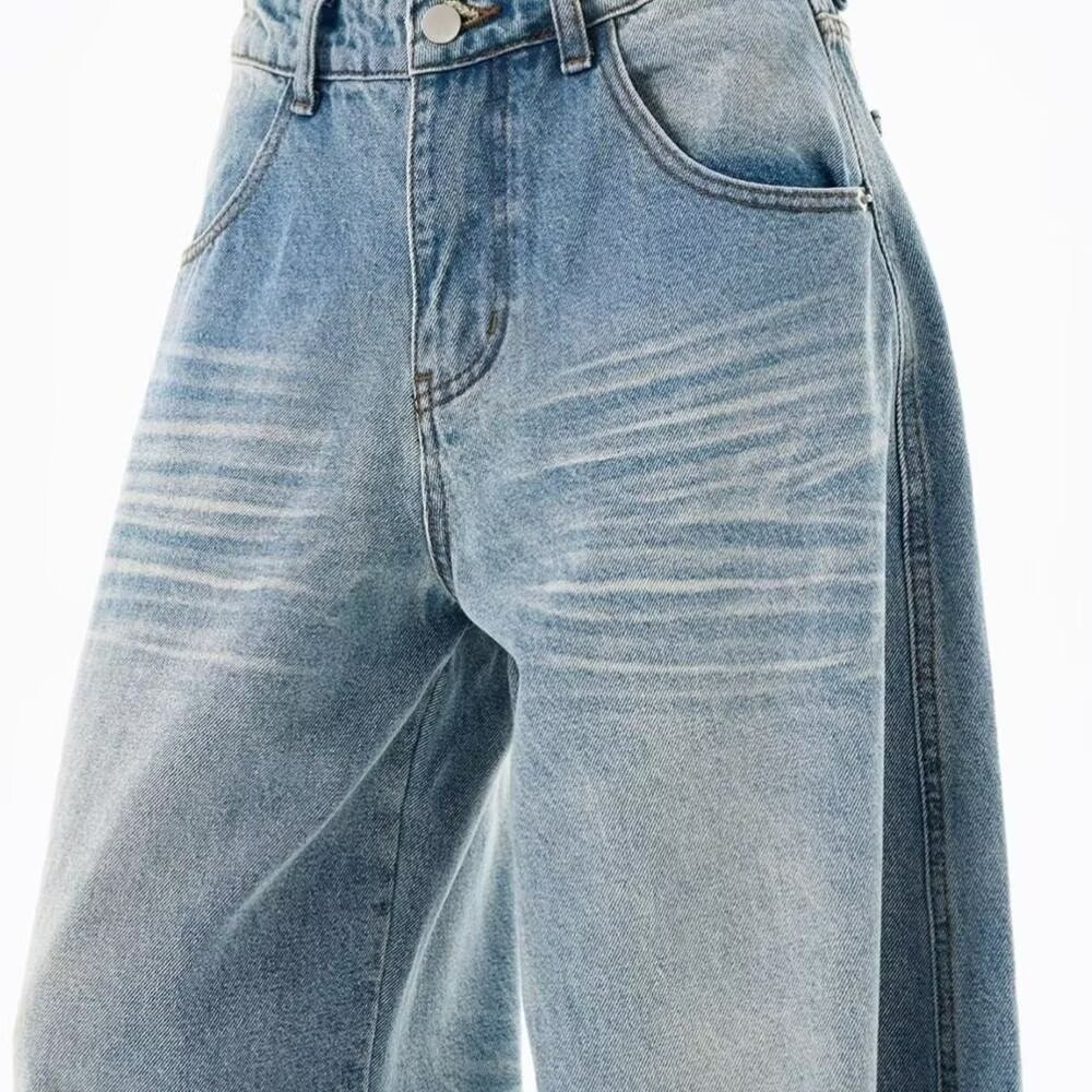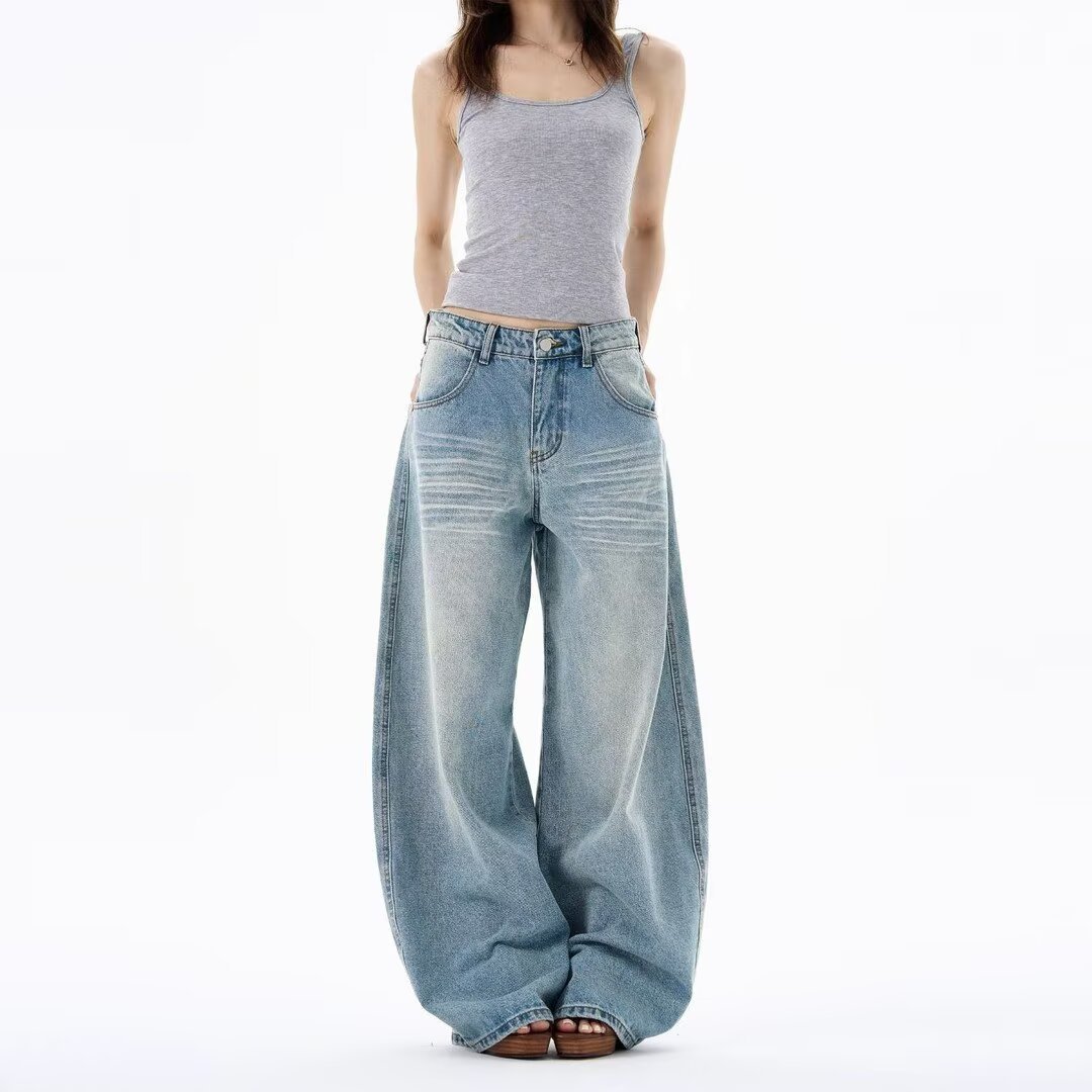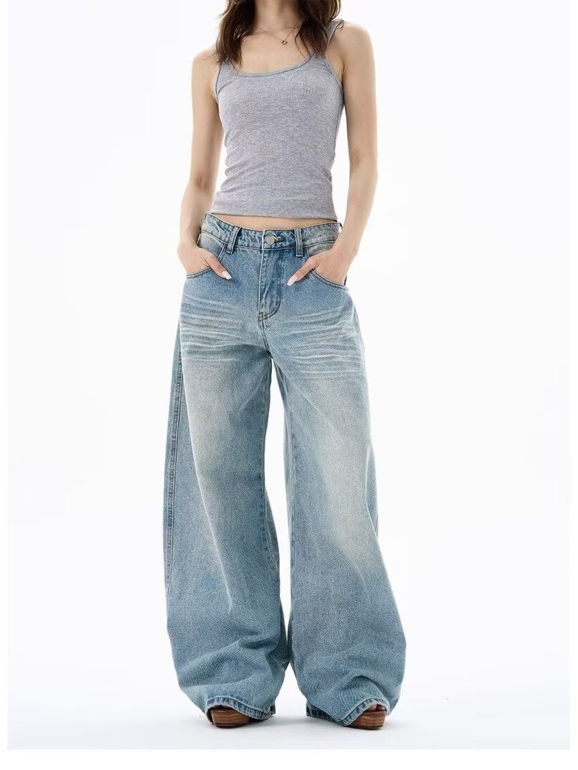 Light-Colored Ripped Jeans for Women, Spring and Autumn, Plus Size, Low-Rise, Pocket Design, Wide-Leg, Straight, Floor-Length Pants