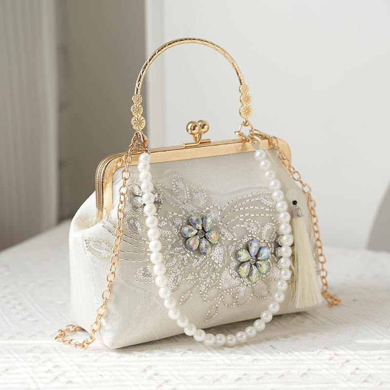 2025 Pearl Embroidered Fashion Silk Satin Texture Handbag Cheongsam Banquet Bag Clutch Bag Chain Bag Shoulder Bag Women