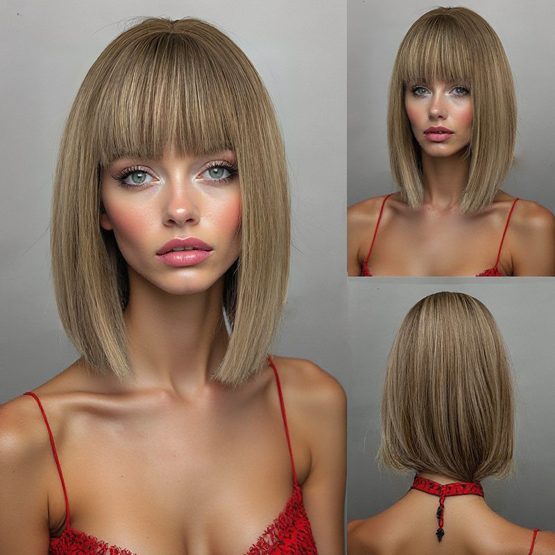 Shiny short straight bob wig with neat bangs female synthetic fiber hair replacement for everyday
