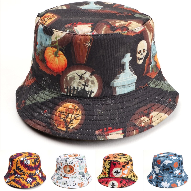 European and American Foreign Trade New Halloween Bucket Hat Cross-Border Printed Skull Double-Sided Hip-Hop Fisherman Hat Sun Hat Trendy