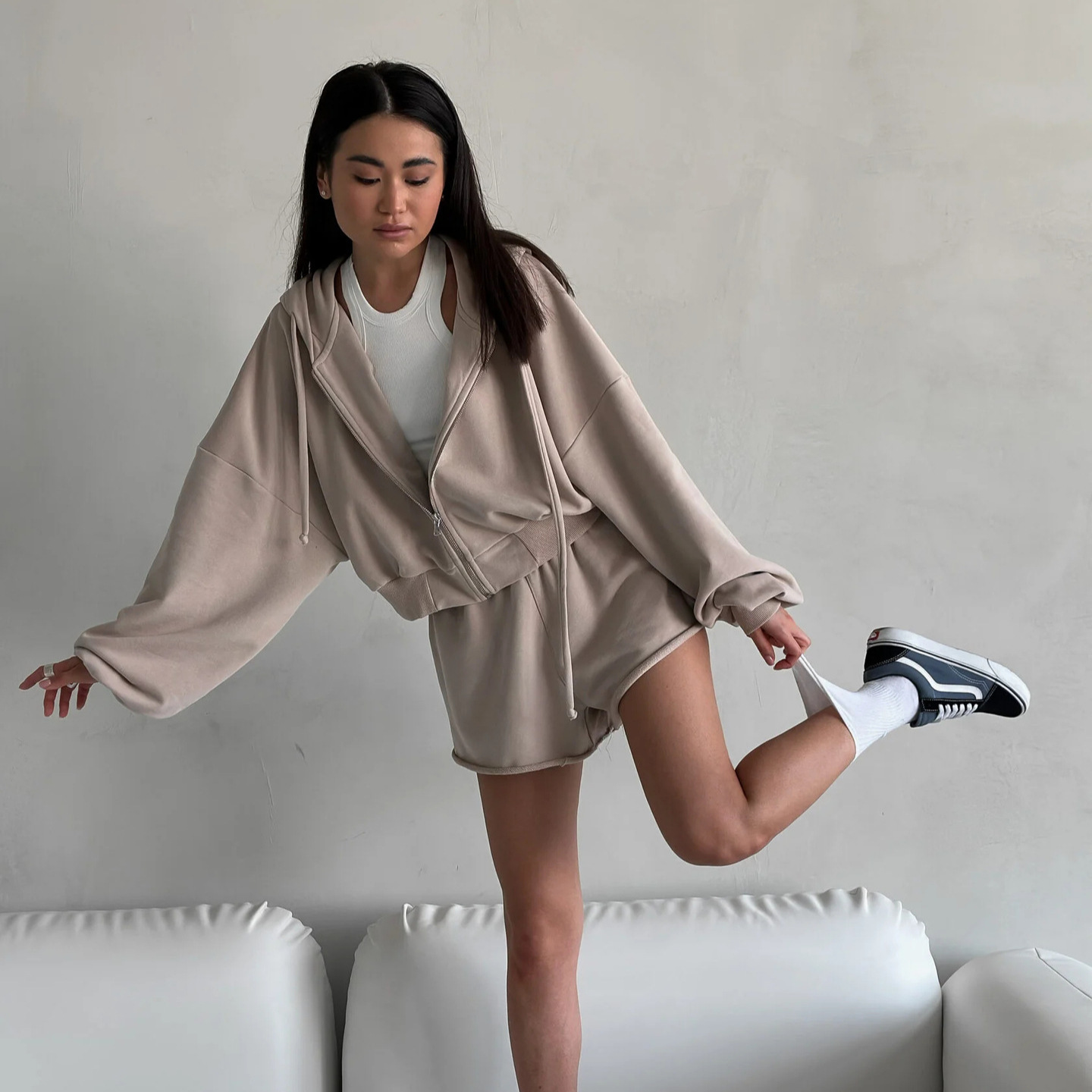 European and American Cross-Border Casual Women's Solid Color Long-Sleeved Hooded Drawstring Sweatshirt Shorts Suit Jacket Shorts Two-Piece Set