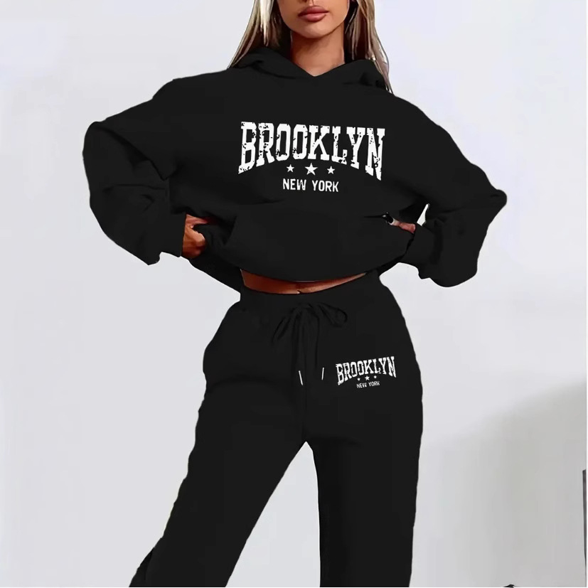 Cross-Border Autumn New Printed Sportswear Suit Women's Large Size Loose Hooded Sweatshirt Casual Straight Pants Two-Piece Set