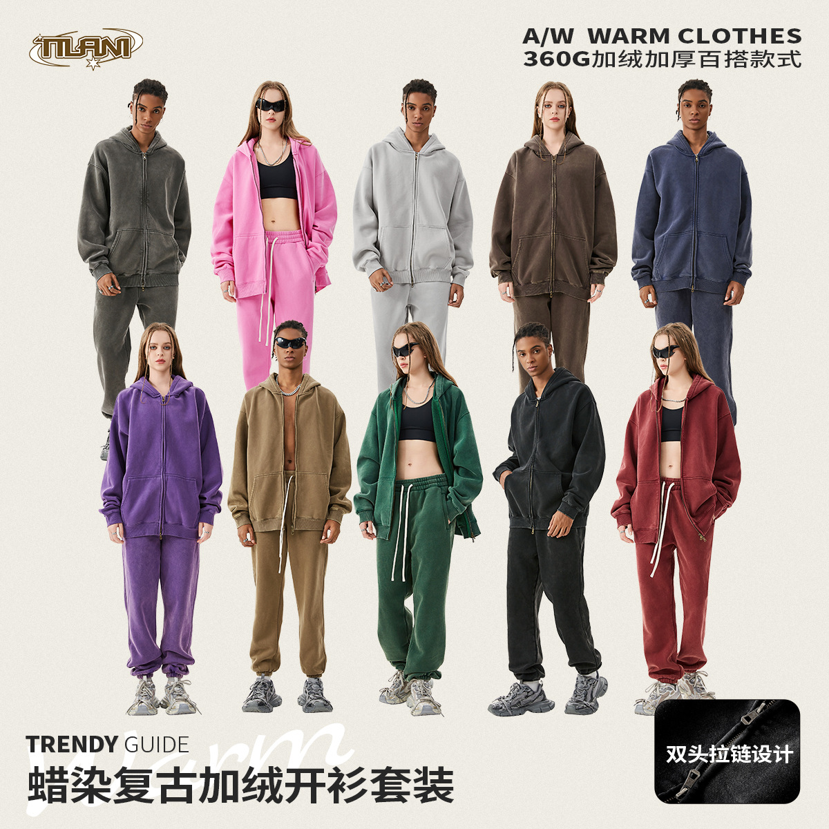 Cross-border New Men's and Women's Zipper Cardigan Casual Trendy fleece-lined Sweater suit Drawstring Hoodie Sweater Pants Two-piece Set