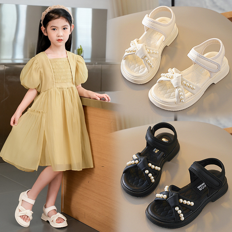 Girls Sandals 2024 Summer New Children's Pearl Princess Shoes Soft Sole Summer Little Girls Middle and Large Children's Beach Shoes