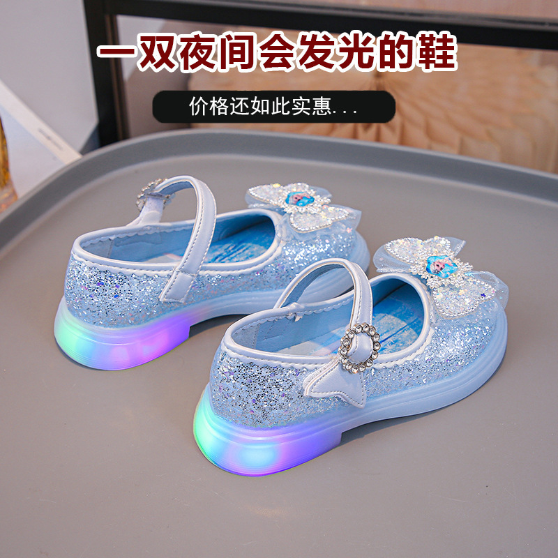 2025 New Elsa Girls Princess Shoes Crystal Spring and Autumn Soft Sole Shoes Fashionable Little Girls Children's Leather Shoes with Lights