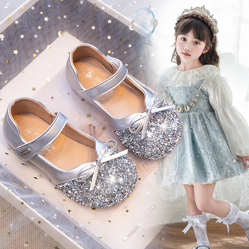 Girl's Shoes Princess Shoes Spring and Autumn Children's Crystal Shoes 2025 New Leather Shoes Autumn Soft-soled Little Girl's silver Shoes
