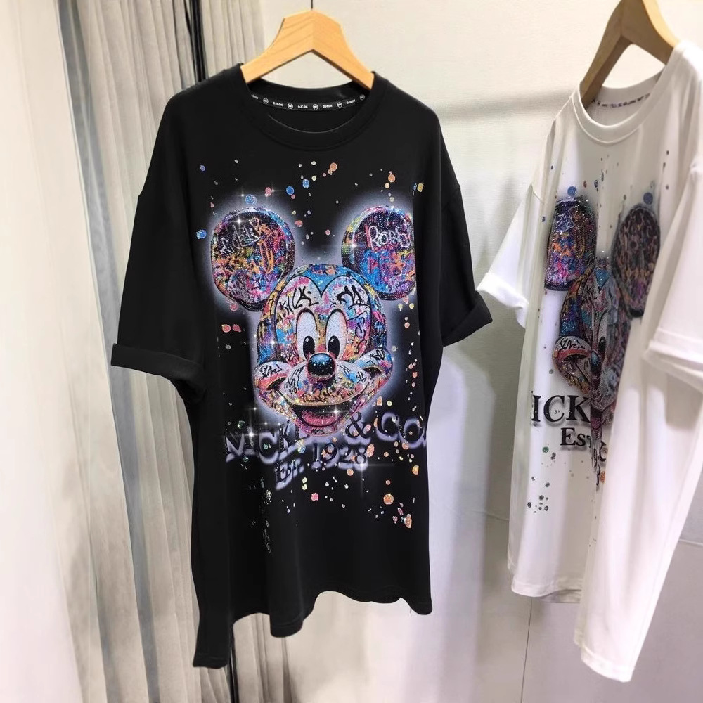 Plus-Size European-Style Heavy Rhinestone Mickey T-Shirt Women's Short-Sleeve European and American Style Round Neck Loose Top