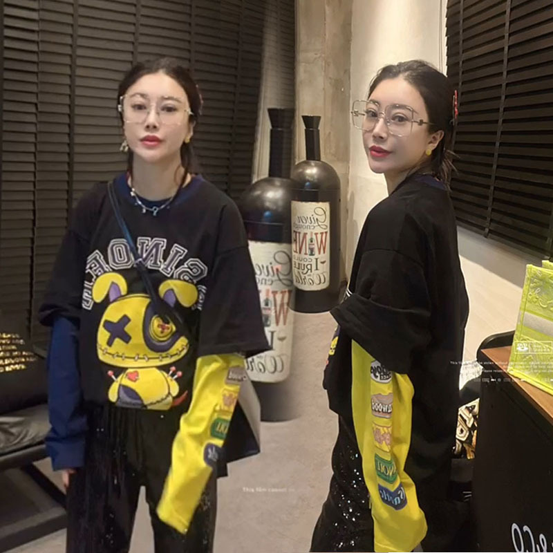 Super plus size 1.00 kg-150.00 kg chubby girl Spring and Summer Cartoon Pattern Printing Color Stitching AB Sleeve Fake Two Loose T-Shirt Women