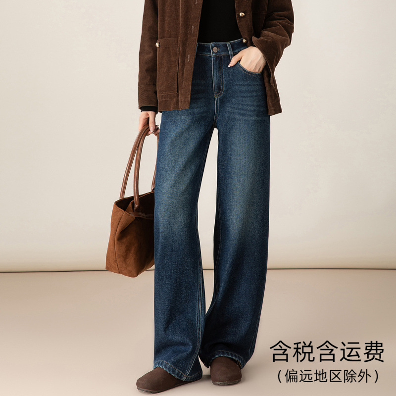 Xinge Fleece-Lined Dark Blue Long Straight Jeans for Women 2025 Winter New Loose Slimming Narrow Wide-Leg Pants