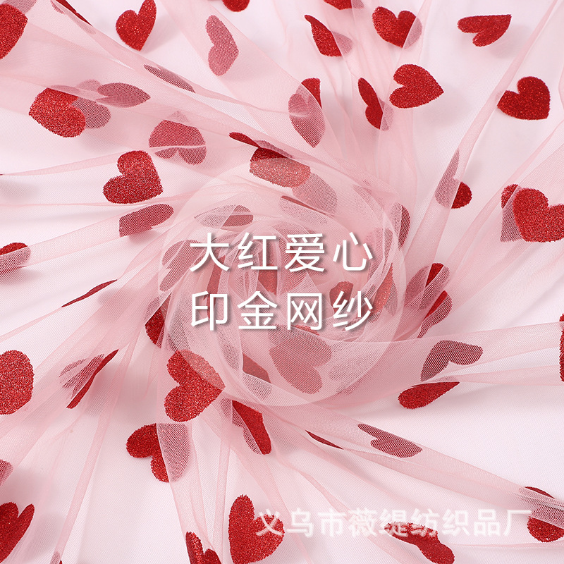 New Tulle Mesh Red Heart Printed Gold Powder Princess Dress Mesh Cloth Toy Clothing Accessories Dress Fabric Women's Clothing
