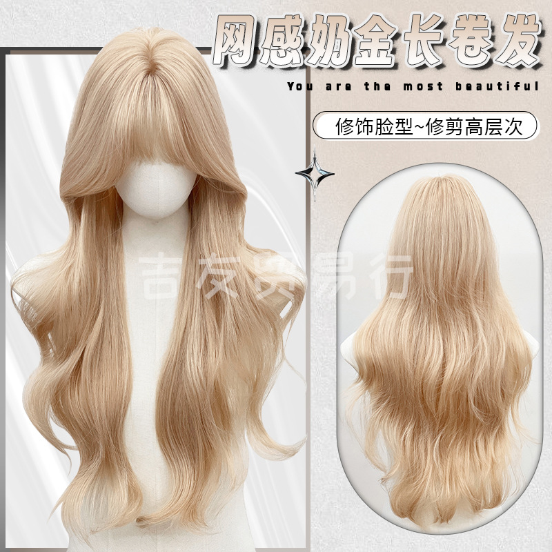Jiyou Trade Wig Milk Blonde Long Curly Hair Mesh High Level Modified Face Cute Lolita Full Head Cover