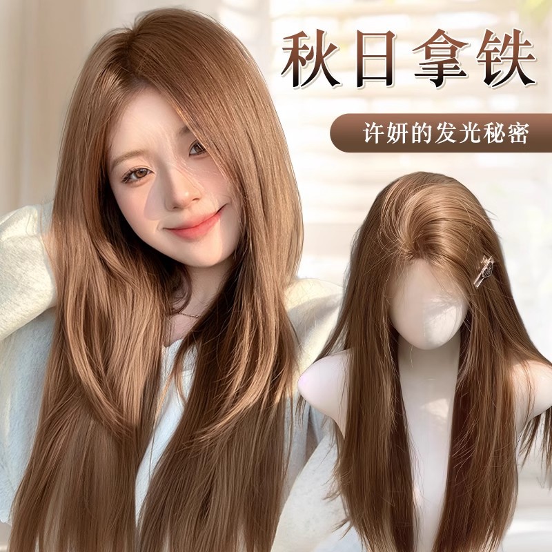 Xu Yan's Same Style Wig for Women, Honey Tea Color, Middle Part, Long Straight Hair, Sweet Girl, Age-Reducing, Brightening, Everyday Full Wig Set