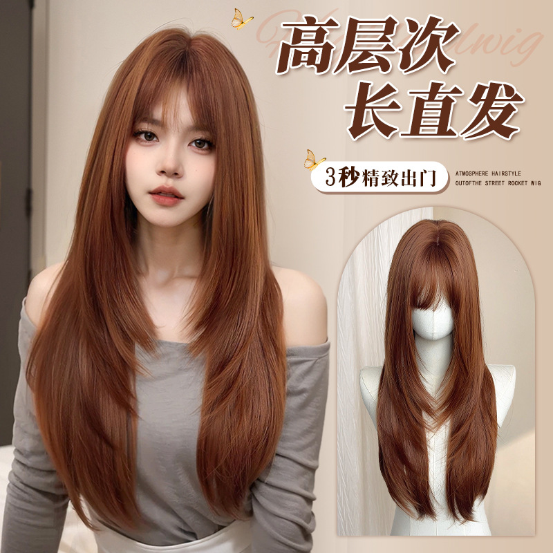 [Orange Soda] Also Has a Cute Wig for Women with Long Straight Hair in Orange-Brown, High-Layered Style, Natural Full Wig, Same Style as the Blogger