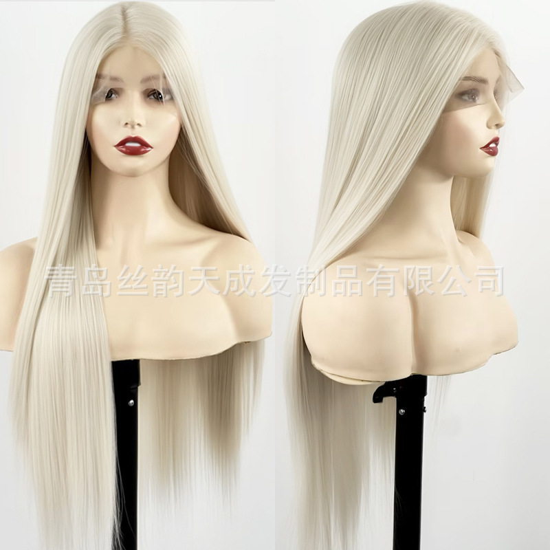 Lazada Cross-Border Best-Selling Off-White Long Straight Hair Wig 13*4 Hand-Crocheted Front Lace Synthetic Fiber Wig
