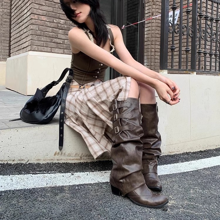 Miu's 2024 New Model~ Versatile Leather Long Boots for Dresses, Casual Wear, Vintage Cowboy Boots, Belt Buckle Riding Boots
