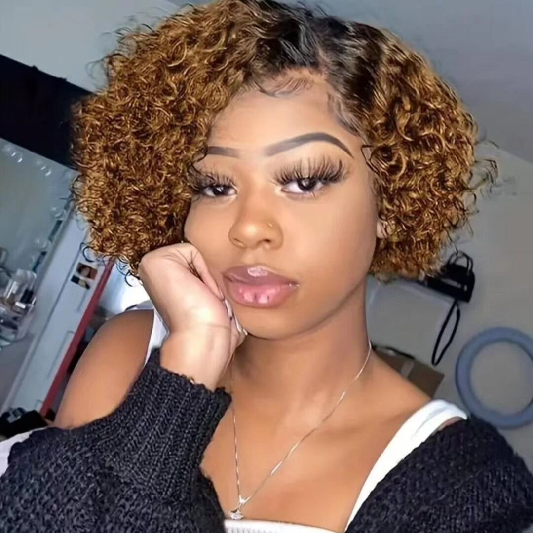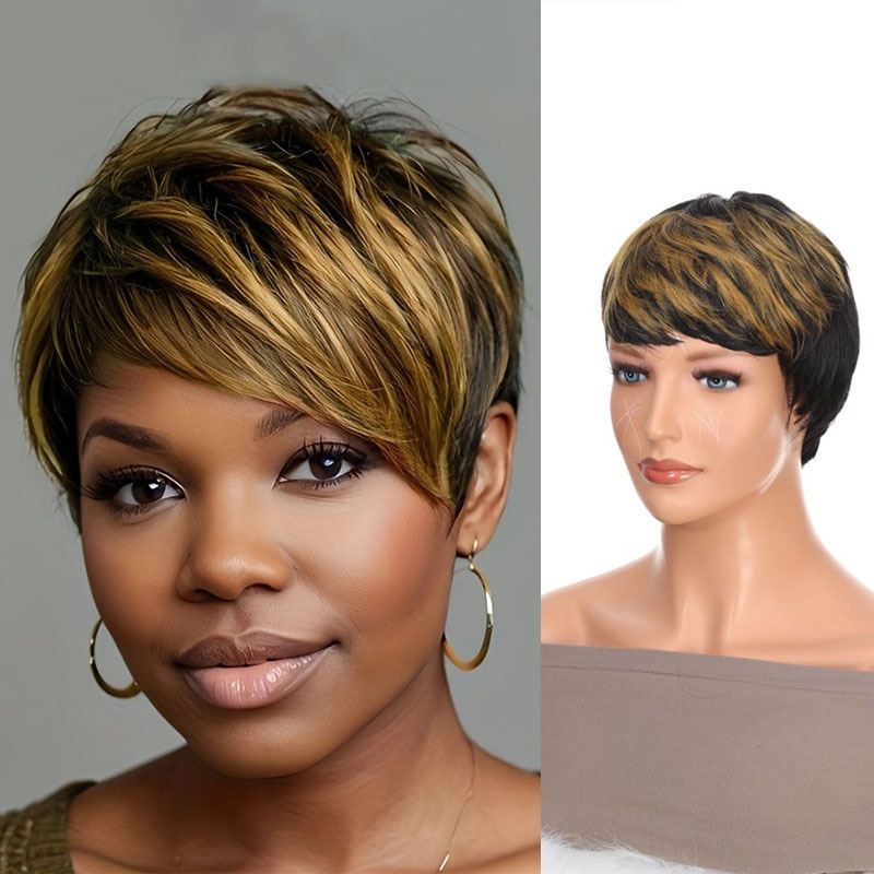 Cross-Border Wig European and American Fashionable Women's Short Curly Hair Highlighted with Golden Slightly Curly Full Short Elf Wig Full Headgear