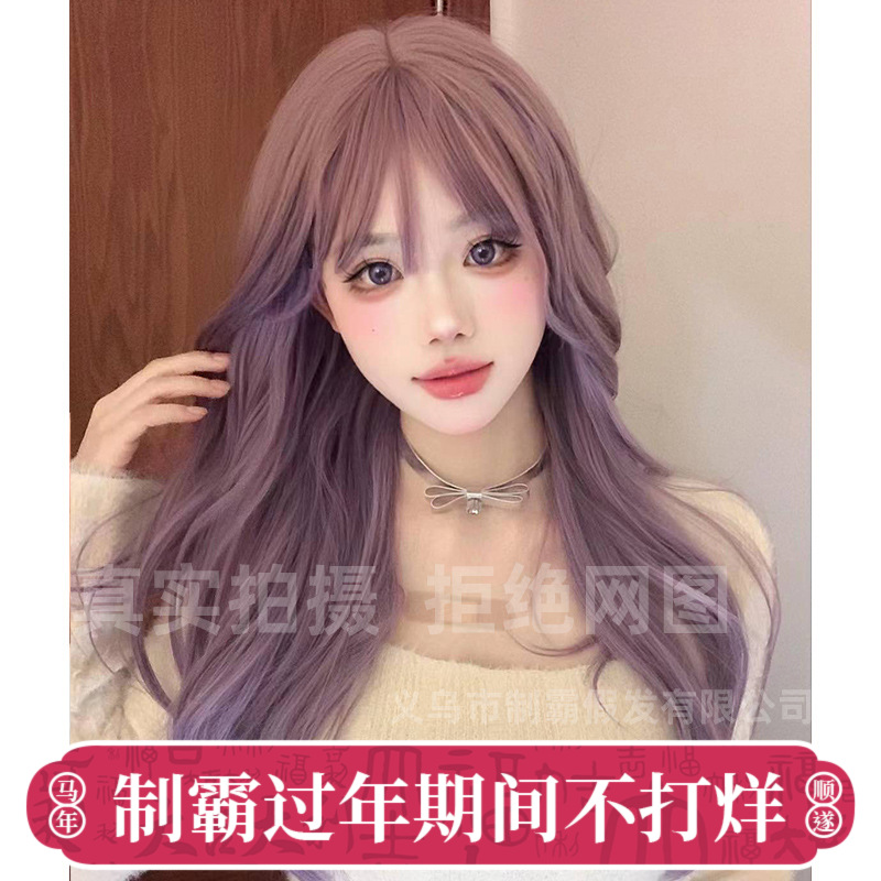 Wholesale wig women's long hair fashion Net red same style milk yellow gradient pink natural air bangs curly hair full head cover