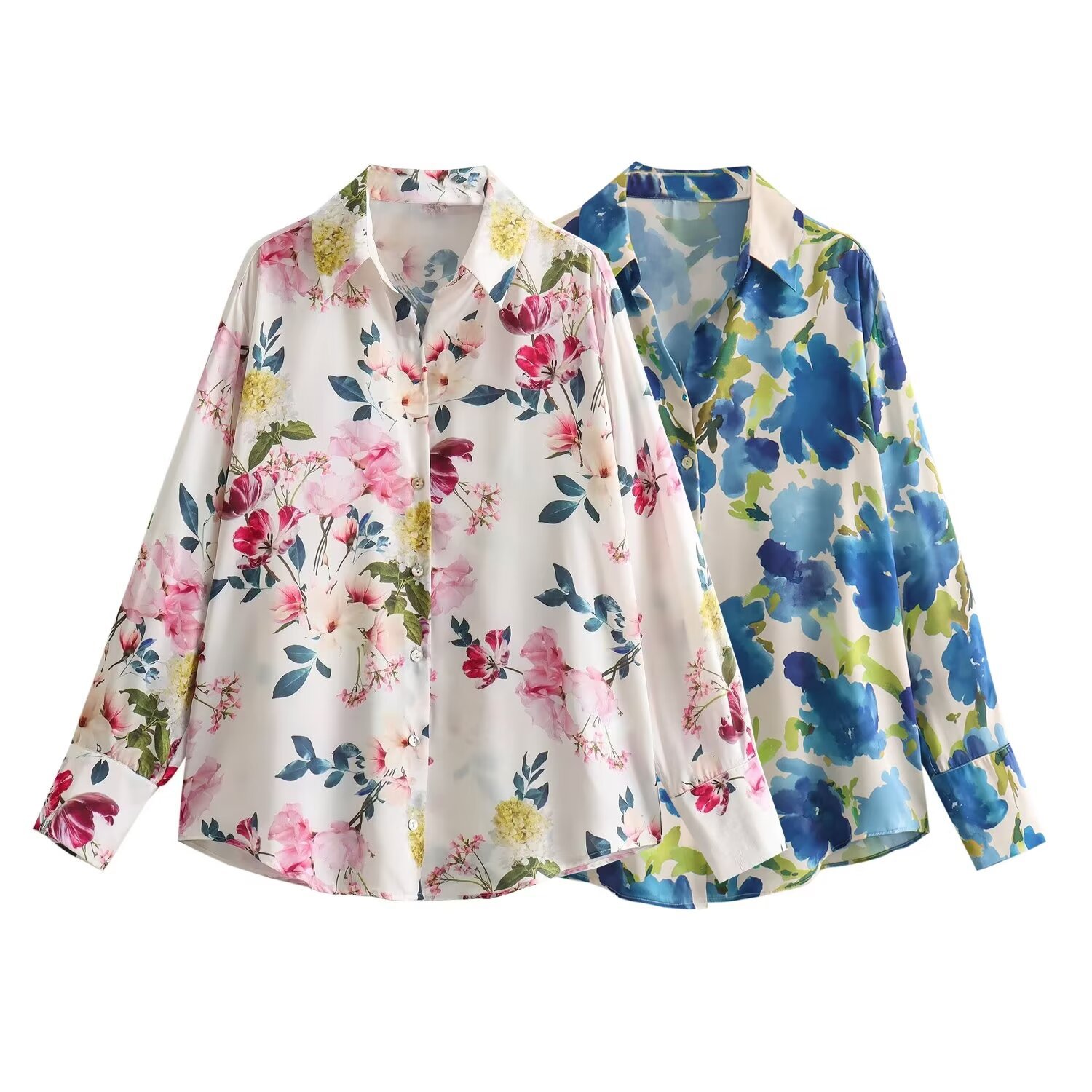 Foreign trade women's ZA series 2024 European and American style leisure retro temperament silk satin texture printed shirt 2248802