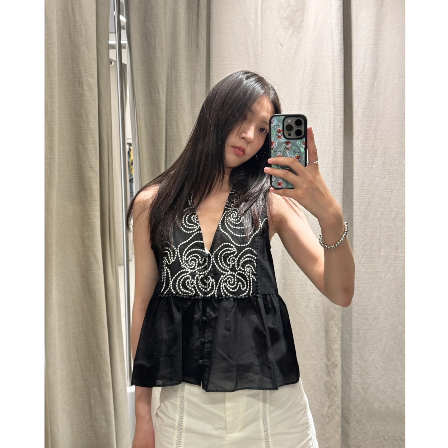 Za Women's Clothing Wholesale Cross-Border 2025 Simple Loose V Neck Cut Out Embroider Sleeveless Shirt Top 3666075